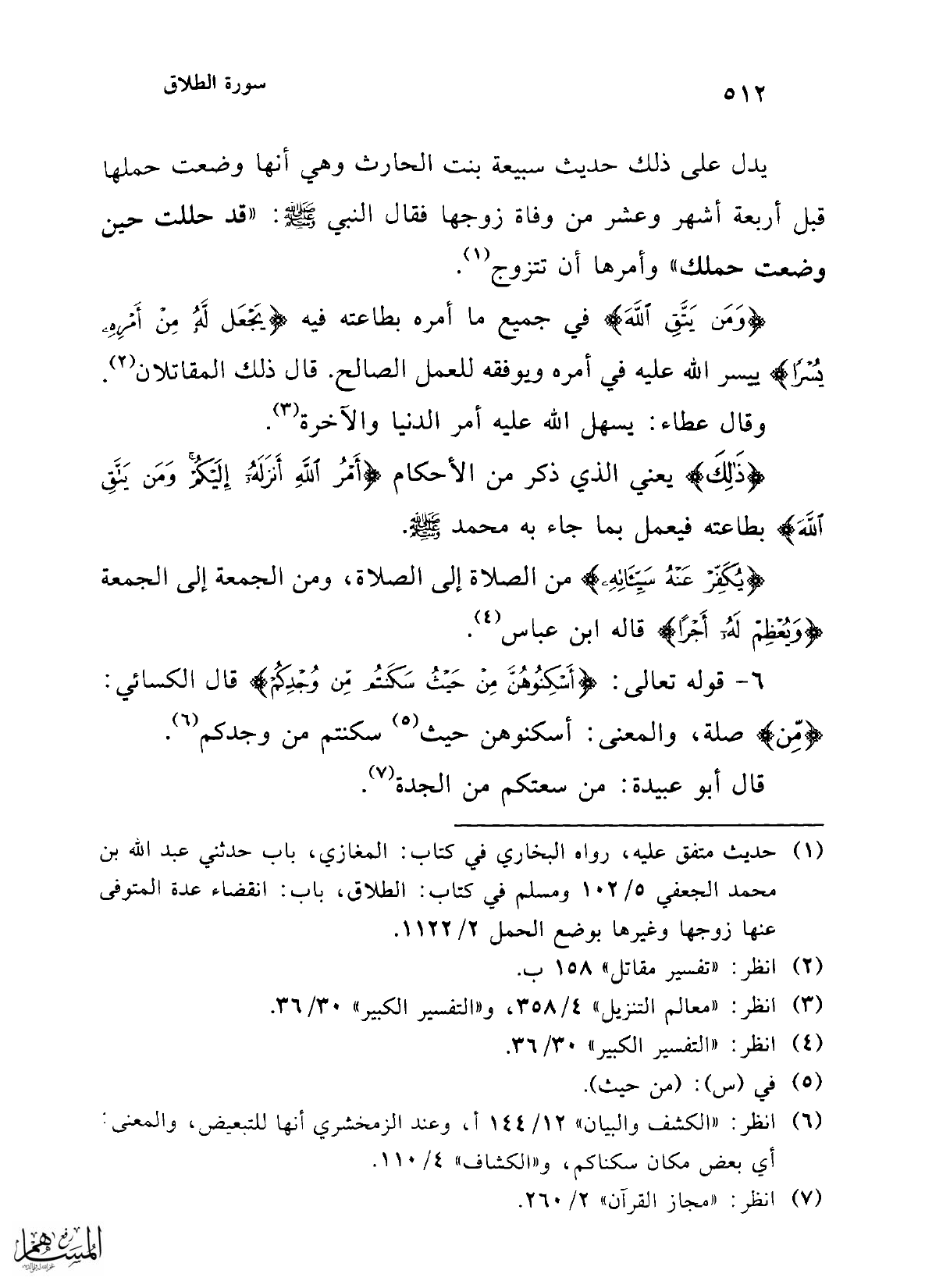 (¬1) حديث متفق عليه، رواه البخاري في كتاب: المغازي، باب حدثني عبد الله بن محمد الجعفي 5/ 102 ومسلم في كتاب: الطلاق، باب: انقضاء عدة المتوفى عنها زوجها وغيرها بوضع العمل 2/ 1122.