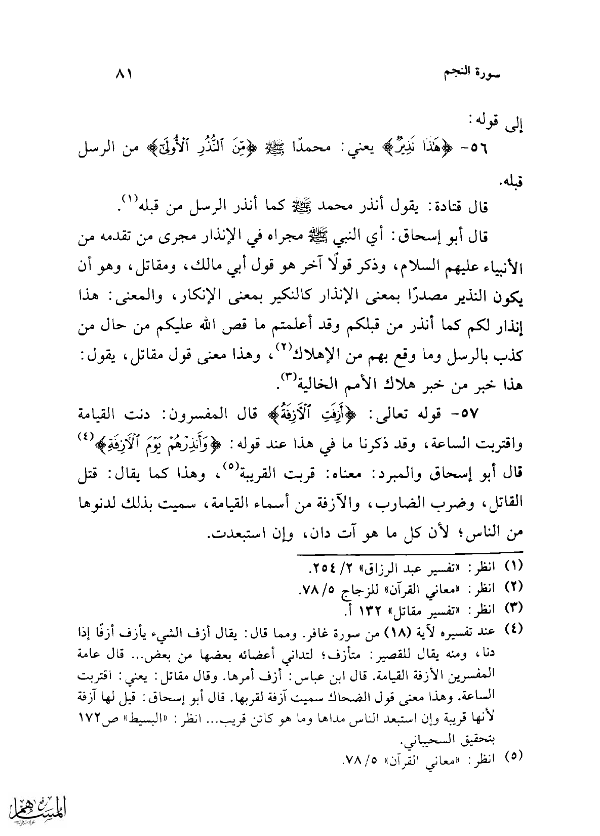 قال أبو إسحاق: أي النبي -صلى الله عليه وسلم- مجراه في الإنذار مجرى من تقدمه من الأنبياء عليهم السلام، وذكر قولًا آخر هو قول أبي مالك، ومقاتل، وهو أن يكون النذير مصدرًا بمعنى الإنذار كالنكير بمعنى الإنكار، والمعنى: هذا إنذار لكم كما أنذر من قبلكم وقد أعلمتم ما قص الله عليكم من حال من كذب بالرسل وما وقع بهم من الإهلاك (¬2)، وهذا معنى قول مقاتل، يقول: هذا خبر من خبر هلاك الأمم الخالية (¬3).