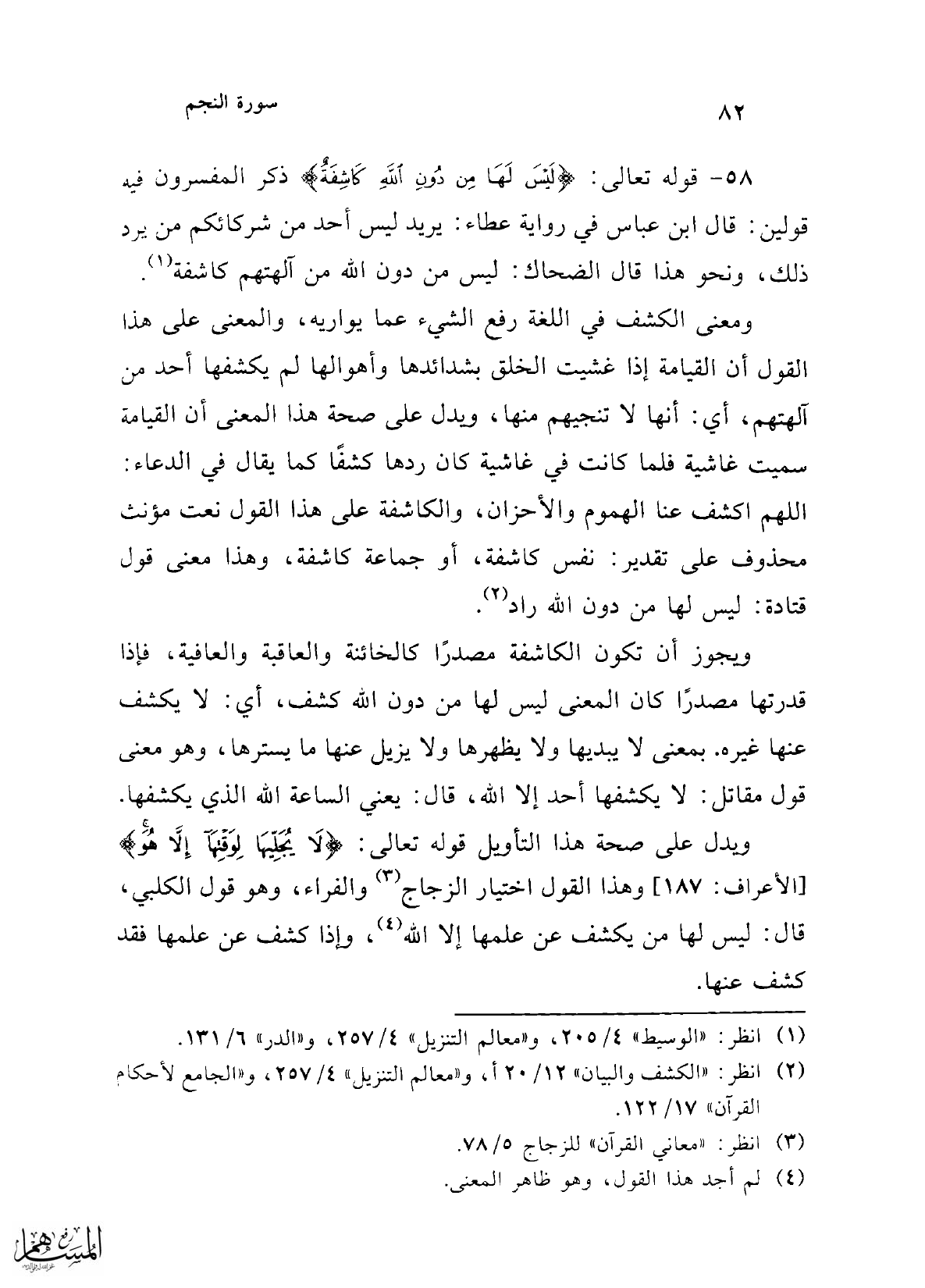 58 - قوله تعالى: {لَيْسَ لَهَا مِنْ دُونِ اللَّهِ كَاشِفَةٌ} ذكر المفسرون فيه قولين: قال ابن عباس في رواية عطاء: يريد ليس أحد من شركائكم من يرد ذلك، ونحو هذا قال الضحاك: ليس من دون الله من آلهتهم كاشفة (¬1).
