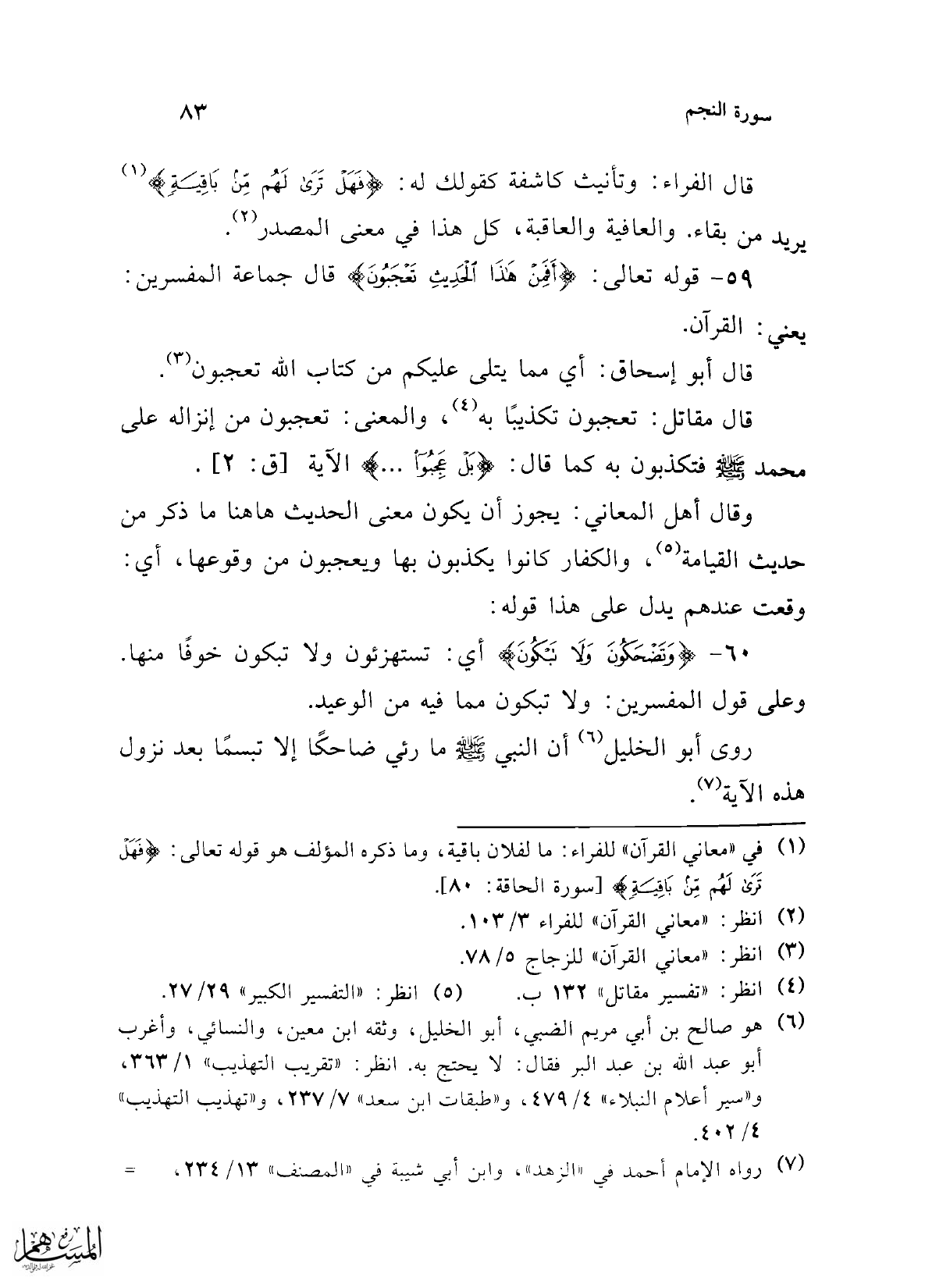 59 - قوله تعالى: {أَفَمِنْ هَذَا الْحَدِيثِ تَعْجَبُونَ} قال جماعة المفسرين: يعني: القرآن.