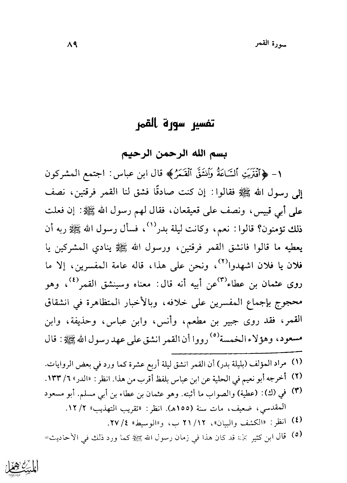 1 - {اقْتَرَبَتِ السَّاعَةُ وَانْشَقَّ الْقَمَرُ} قال ابن عباس: اجتمع المشركون إلى رسول الله -صلى الله عليه وسلم- فقالوا: إن كنت صادقًا فشق لنا القمر فرقتين، نصف على أبي قبيس، ونصف على قعيقعان، فقال لهم رسول الله -صلى الله عليه وسلم-: إن فعلت ذلك تؤمنون؟ قالوا: نعم، وكانت ليلة بدر (¬1)، فسأل رسول الله -صلى الله عليه وسلم- ربه أن يعطيه ما قالوا فانشق القمر فرقتين، ورسول الله -صلى الله عليه وسلم- ينادي المشركين يا فلان يا فلان اشهدوا (¬2)، ونحن على هذا، قاله عامة المفسرين، إلا ما روى عثمان بن عطاء (¬3) عن أبيه أنه قال: معناه وسينشق القمر (¬4)، وهو محجوج بإجماع المفسرين على خلافه، وبالأخبار المتظاهرة في انشقاق القمر، فقد روى جبير بن مطعم، وأنس، وابن عباس، وحذيفة، وابن مسعود، وهؤلاء الخمسة (¬5) رووا أن القمر انشق على عهد رسول الله -صلى الله عليه وسلم-: قال