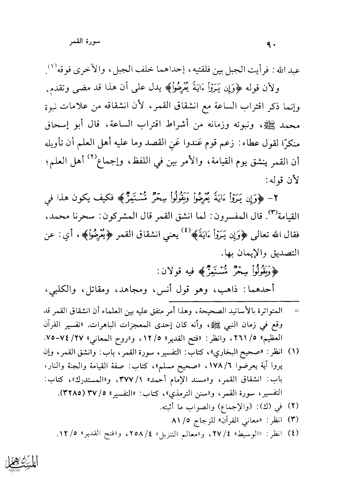 ولأن قوله {وَإِنْ يَرَوْا آيَةً يُعْرِضُوا} يدل على أن هذا قد مضى وتقدم، وإنما ذكر اقتراب الساعة مع انشقاق القمر؛ لأن انشقاقه من علامات نبوة محمد -صلى الله عليه وسلم-، ونبوته وزمانه من أشراط اقتراب الساعة، قال أبو إسحاق منكرًا لقول عطاء: زعم قوم عَندوا عَنِ القصد وما عليه أهل العلم أن تأويله أن القمر ينشق يوم القيامة، والأمر بين في اللفظ، وإجماع (¬2) أهل العلم؛ لأن قوله: