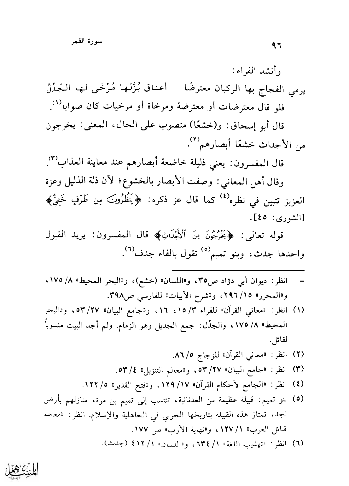 (¬1) انظر: "معاني القرآن" للفراء 3/ 15، 16، و"جامع البيان" 27/ 53، و"البحر المحيط" 8/ 175، والجدُل: جمع الجديل وهو الزمام. ولم أجد البيت منسوبًا لقائل.