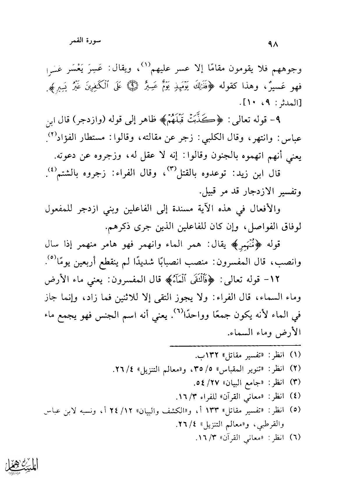 (¬5) انظر: "تفسير مقاتل" 133 أ، و"الكشف والبيان" 12/ 24 أ، ونسبه لابن عباس والقرطبي، و"معالم التنزيل" 4/ 26.