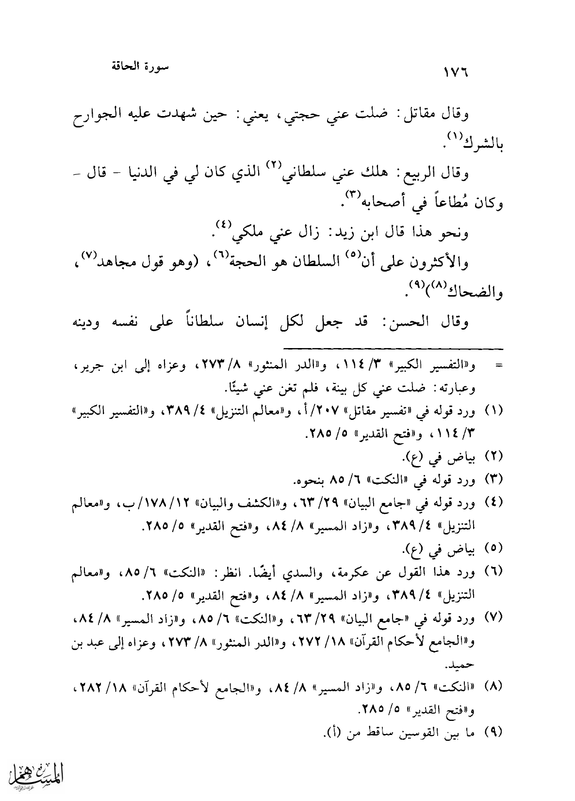 (¬4) رحبة الكوفة: يراد بالرحبة: الشيء الواسع، من الرَّحب، ورَحبة المسجد والدار: ساحتها ومتسعها، ويقال للصحراء بين أفنية القوم والمسجد: رحبة. "لسان العرب" 1/ 414 - 415. والكوفة: العصر المشهورة بأرض بابل من سواد العراق، سميت بذلك لاستدارتها، وقيل لاجتماع الناس فيها، من قولهم: قد تكوفت الرمل. مصّرها سعد بن أبي وقاص بأمر عمر بن الخطاب سنة 17 هـ, وتقع على الجانب الأيمن لنهر الكوفة؛ أحد فروع الفرات، وكانت مقر خلافة علي بن أبي طالب -رضي الله عنه-، وبها مسجد الكوفة الشهير الذي قتل فيه الإمام علي. انظر: "معجم ما استعجم من أسماء البلاد" للبكري 4/ 1141، و"معجم البلدان" لياقوت الحموي 4/ 490، و"مراصد الاطلاع" للبغدادي 3/ 1187، و"الموسوعة العربية الميسرة" 2/ 1505. وقد ورد قوله في "تفسير" عبد الرزاق 2/ 315، و"جامع البيان" 2/ 639، و"الكشف والبيان" جـ: 12: 178/ ب، و"معالم التنزيل" 4/ 389، و"المحرر الوجيز" 5/ 361، و"زاد المسير" 8/ 85، و"الجامع لأحكام القرآن" 18/ 272 و"لباب التأويل" 4/ 306، و"الدر المنثور" 8/ 373 - 374, وعزاه إلى ابن المبارك، وهناد في الزهد، وعبد بن حميد، وابن المنذر، و"فتح القدير" =