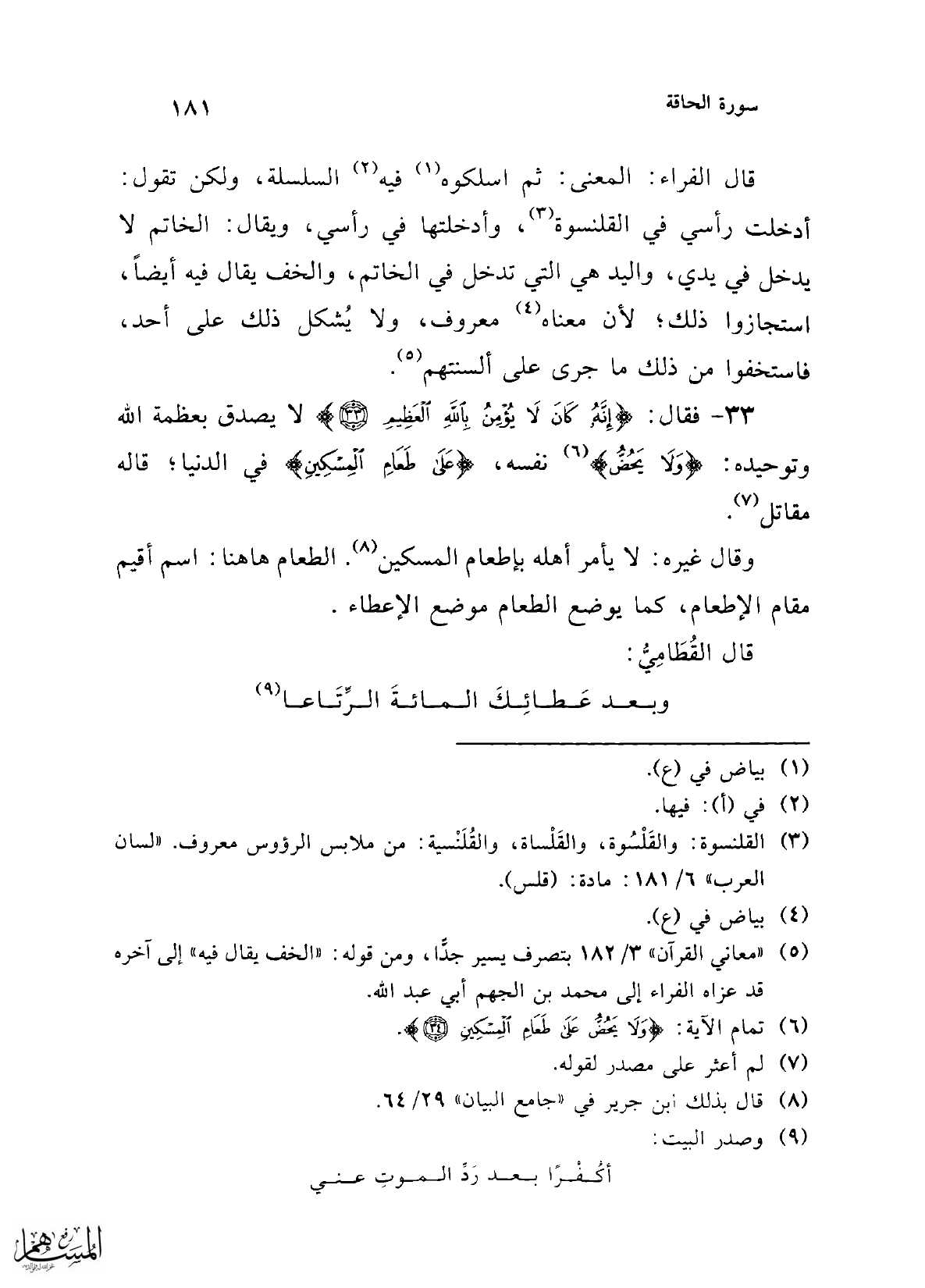 (¬6) لم أجد تفسيره في معانيه، ولكن وجدته بنصه في "لسان العرب" 11/ 495: مادة: (غسل)، والعبارة الواردة عن الأخفش في "معاني القرآن" قال: وجعله -والله أعلم- من الغَسْل، وزاد الياء والنون بمنزلة "عُفرين" و"كُفْرِين" 2/ 713.