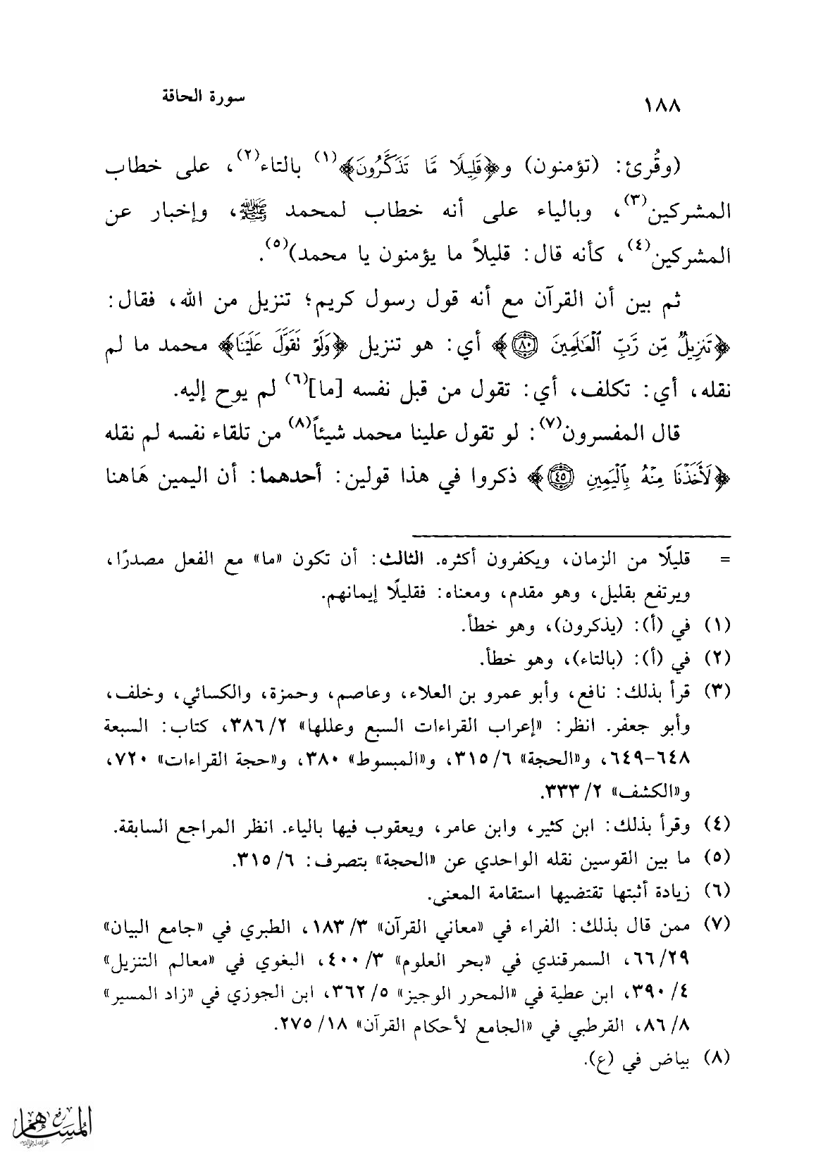 (¬6) ورد قوله في "النكت" 6/ 86، والعبارة عنه: "لقطعنا يده اليمنى"، "والتفسير الكبير" 30/ 118، وعنه: لقطعنا وتينه، و"البحر المحيط" 8/ 329، وعنه: قطعناه عبرة ونكالًا.