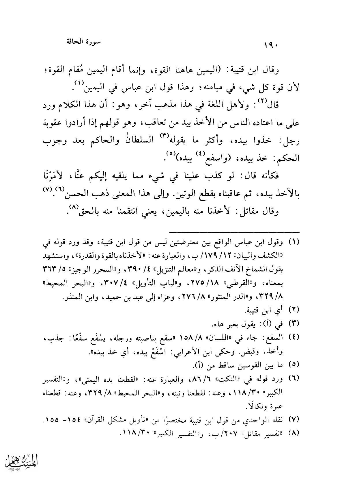 (¬4) ساقطة من (أ). وقد ورد قوله في "جامع البيان" 29/ 67، و"الكشف والبيان" جـ: 12: 180/ أ، و"النكت" 6/ 87، و"معالم التنزيل" 4/ 391، و"المحرر الوجيز" 5/ 362، و"زاد المسير" 8/ 81، و"الجامع لأحكام القرآن" 18/ 276، و"لباب التأويل" 4/ 307، و"البحر المحيط" 8/ 329، و"تفسير القرآن العظيم" 4/ 445، و"الدر المنثور" 8/ 276، وعزاه إلى الفريابي، وسعيد بن منصور، وعبد بن حميد، وابن جرير، وابن المنذر، وابن أبي حاتم، والحاكم، وصححه؛ "المستدرك" 2/ 501، في التفسير، تفسير سورة الحاقة، قال الحاكم: صحيح، ووافقه الذهبي، وقد رواه الحاكم من طريق عطاء بن السائب عن سعيد بن جبير عن ابن عباس، وإسناده قوي؛ لأنه من رواية الثوري عن عطاء، وسمعه منه قبل الاختلاط. قاله الحافظ ابن حجر في "فتح الباري" 8/ 664، وزاد نسبته إلى الفريابي، والأشجعي. وانظر حاشية "النكت" 6/ 87.