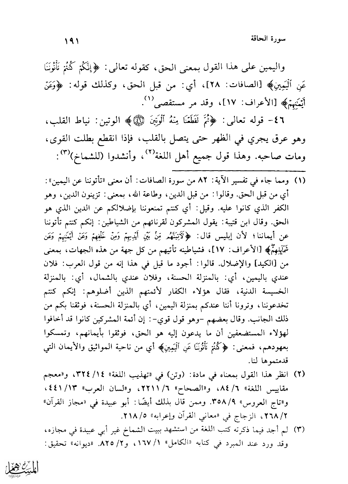 قال ابن قتيبة (¬1): (ولم يُرد أنا نقطعه بعينه فيما يرى أهل النظر (¬2)، ولكنه أراد: لو كذب لأمَتْنَاه، أو قتلناه، فكان كمن قُطِع وتينُه، قال: ومثله قوله -صلى الله عليه وسلم-: "ما زالت أكلة (¬3) خيبر (¬4) تعاودني، فهذا أوانَ قطعَتْ أبْهَري" (¬5).