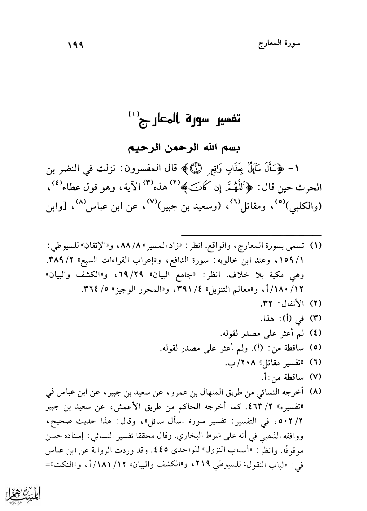 وقال (¬1) الحسن (¬2)، وقتادة (¬3): لما بعث الله محمدًا، وخوف المشكرين بالعذاب، قال المشركون بعضهم لبعض: [سلوا] (¬4) محمدًا لمن هذا العذاب، وبمن يقع؟ فأخبر الله عنهم بقوله: {سَأَلَ سَائِلٌ بِعَذَابٍ وَاقِعٍ (1)}.