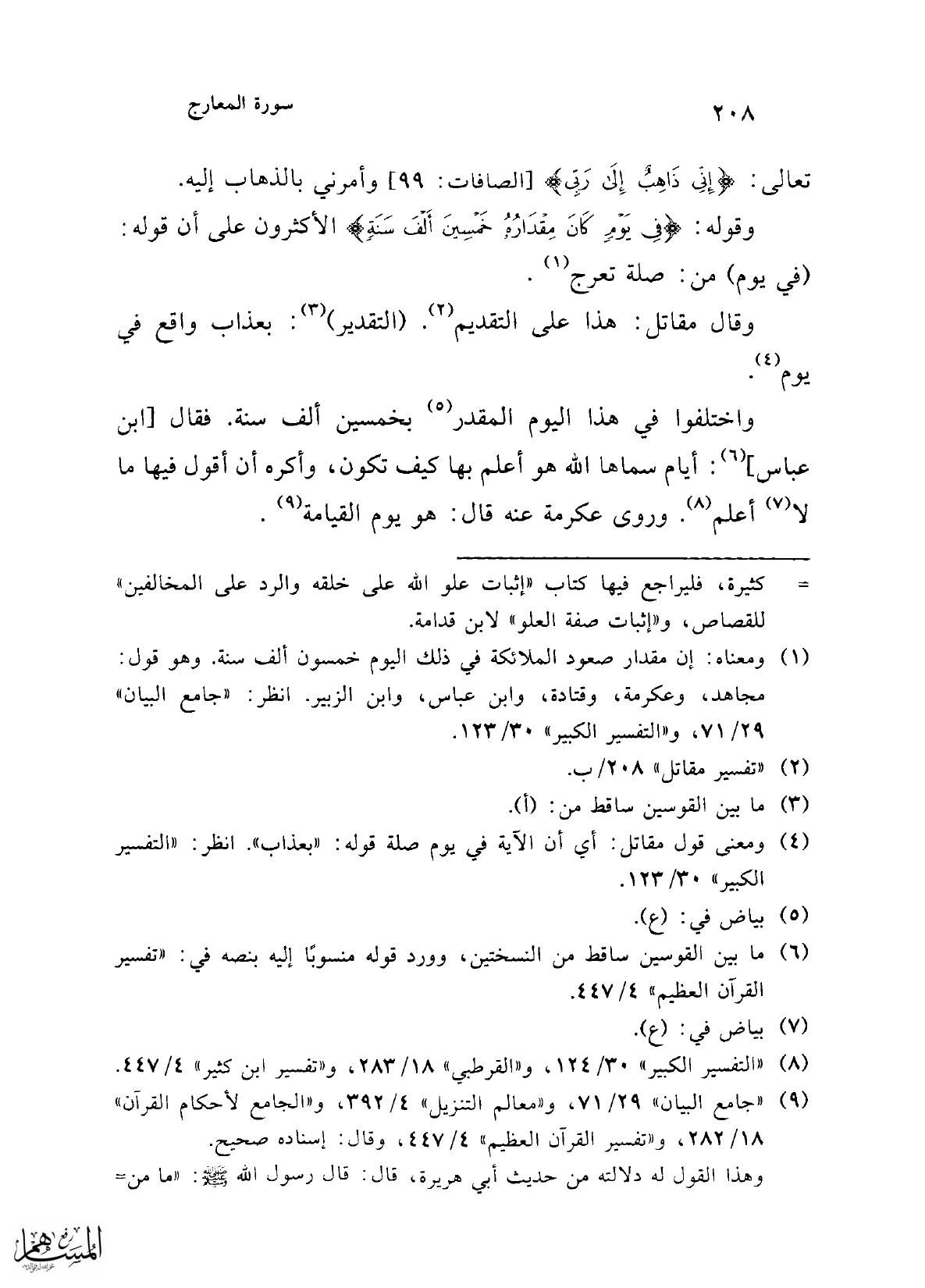 وعلى هذا القول يكون تقدير الآية: في يوم كان مقداره خمسين ألف سنة لو ولي الحساب غير الله. وذكر الكلبي قولاً آخر فقال: تقول تصعد الملائكة والروح إليه في يوم كان مقداره على غيرهم خمسين ألف سنة (¬2). وهذا قول وهب، ومحمد بن إسحاق.