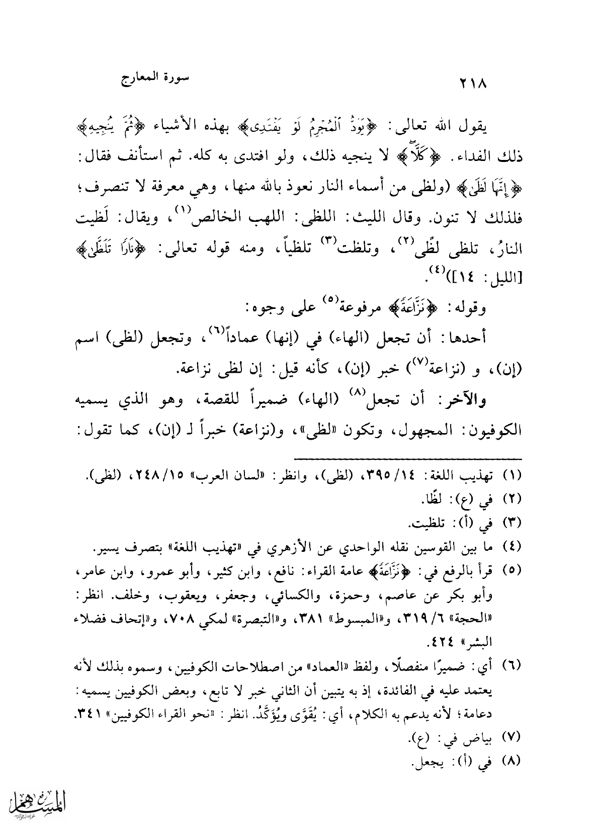 عمل الفعل نحو: صاحب، ودَرٍّ (¬1) في قولك: لله دَرُّك، فإن لم يعمل هذا النحو الذي هو اسمُ فاعل، أو مصدر عمل الفعل من حيث جرى مجرى الأسماء، فأن لا يعمل الاسم المعرفة عمله أولى. ويدلك على تعرف هذا الاسم وكونه علماً أن التنوين لم تلحقه، فإذا كان كذلك لم تنتصب الحال عنه، فإن جعلتها مع تعريفها قد صارت معروفة بشدة التلظي، جاز أن تنصبه بهذا المعنى الحادثِ في العَلَم، وإن علّقت (نزاعة) بفعل مضمر نحو: أعنيها نزاعة للشوى لم يمتنع) (¬2).