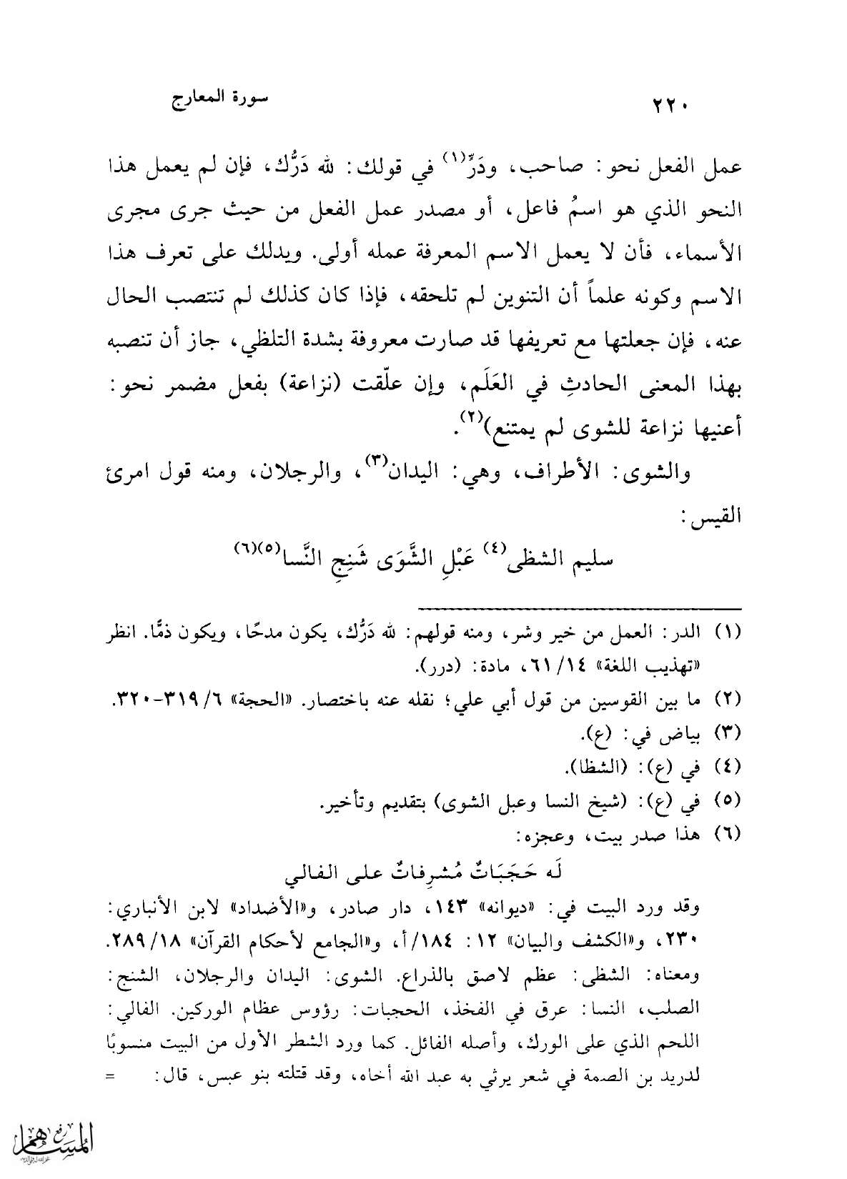 (¬4) "الكشف والبيان" 12/ 183/ ب، و"معالم التنزيل" 4/ 394، و"زاد المسير" 8/ 92، و"التفسير الكبير" 30/ 128. ومعنى العَصَب -بفتحتين-: أطناب المفاصل التي تُلائم بينها وتشدها. انظر: "لسان العرب" 1/ 602 (عصب)، و"المصباح المنير" 2/ 492. والعقب -أيضًا بفتحتين-: أطناب المفاصل، وبكسر القاف: مؤخر القدم، والمراد هنا المعنى الأول. انظر: "المصباح المنير" 2/ 500، (عقب).