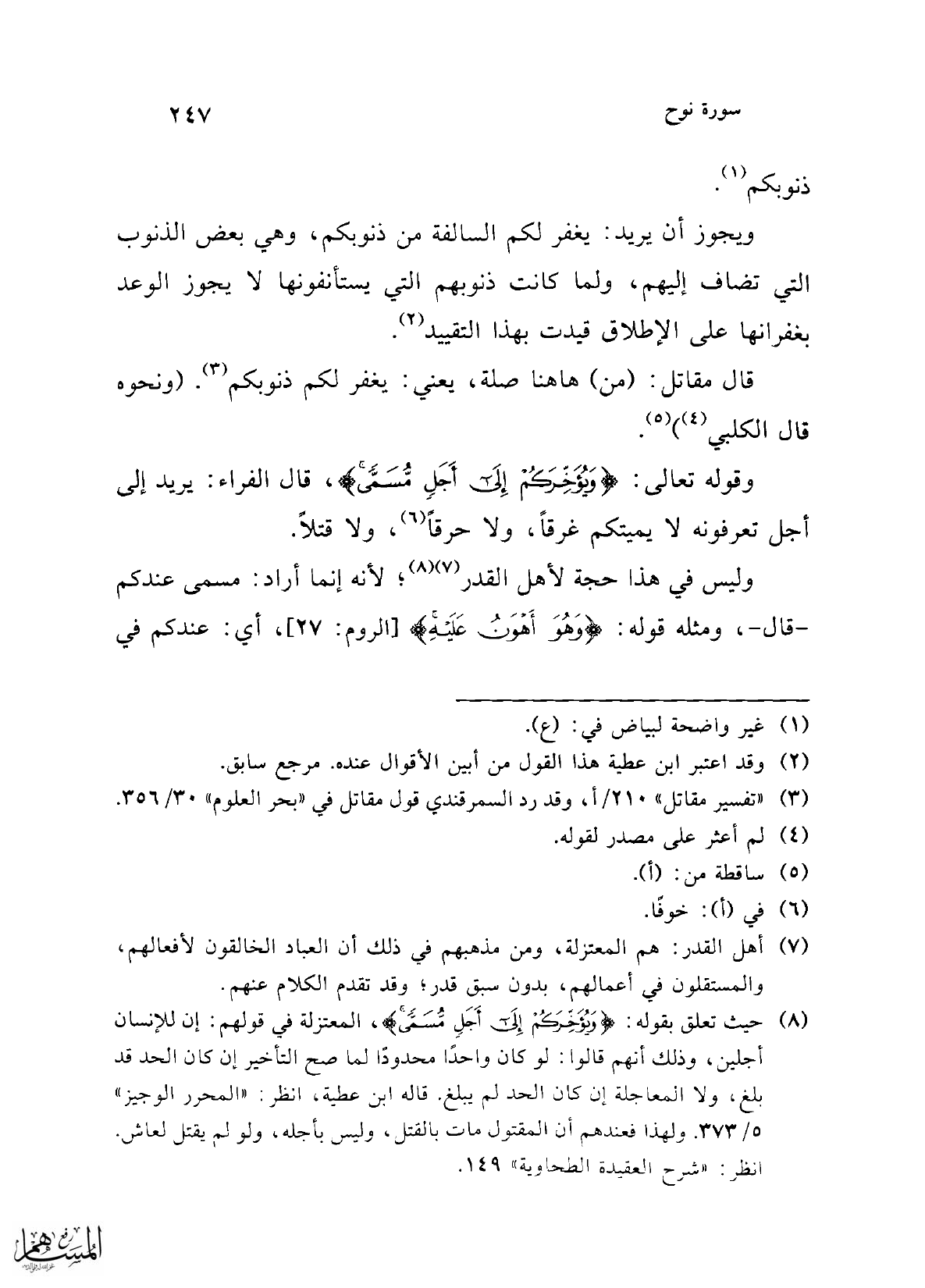 الثاني: موافقته إلى ما ذهبت إليه المعتزلة، يفهم ذلك من قوله: "والصحيح في هذا ما روى عطاء عن ابن عباس إلى قوله: وإن لم يؤمنوا عوجلوا بالعذاب المهلك، فبأي الأجلين أهلكوا كان ذلك بقضاء من الله وقدر" حيث أقر -بقوله هذا- أن للإنسان أجلين، وهو ما تقول به المعتزلة. هذا وقد اختار الطحاوي هذا القول في مشكل الآثار: 4/ 170. وقد اختلفت أقوال العلماء في تفسير الآية، وما شاكلها من أحاديث، كنحو ما جاء عن ابن عباس -رضي الله عنه-، وحديث أنس بن مالك -رضي الله عنه-: "من سره أن يبسط عليه رزقه، أو ينسأ في أثره، فليصل رحمه". صحيح مسلم: 4/ 1982: ح: 2557، كتاب البر والصلة والآداب، باب صلة الرحم. ولتفصيل هذه المسألة انظر: القضاء والقدر في ضوء الكتاب والسنة: لعبد الرحمن صالح المحمود -رسالة ماجستير-: 327. والراجح من الأقوال في مسألة الآجال، وهل تتغير أم هي محددة؟ قول من ذهب إلى أن القدر لا يتغير، وأن التغيير والتبديل لا يكون أبدًا؛ لأن الذي سبق في علم الله كائن لا يتغير، وعلم الله كامل، أحاط بكل شيء، ومنه ما هو كائن، وأن الذي يجوز عليه التغيير والتبديل ما يبدو للناس من عمل العامل، أو ما في علم الحفظة والموكلين بالآدمي، فيقع المحو والإثبات، بمعنى أن ما في اللوح المحفوظ لا يتغير، وما سواه من صحف الملائكة الموكلين بالآدمي قد يدخله التغيير؛ لأن الملائكة لا يعلمون إلا ما علمهم الله، والله يعلم الأشياء قبل كونها. وهذا القول هو الذي عليه المحققون، كابن تيمية في: "مجموع الفتاوى" 4/ 490 - 492، وابن حجر في "فتح الباري" 11/ 448، والشيخ السعدي في "تيسير الكريم الرحمن" 2/ 476.