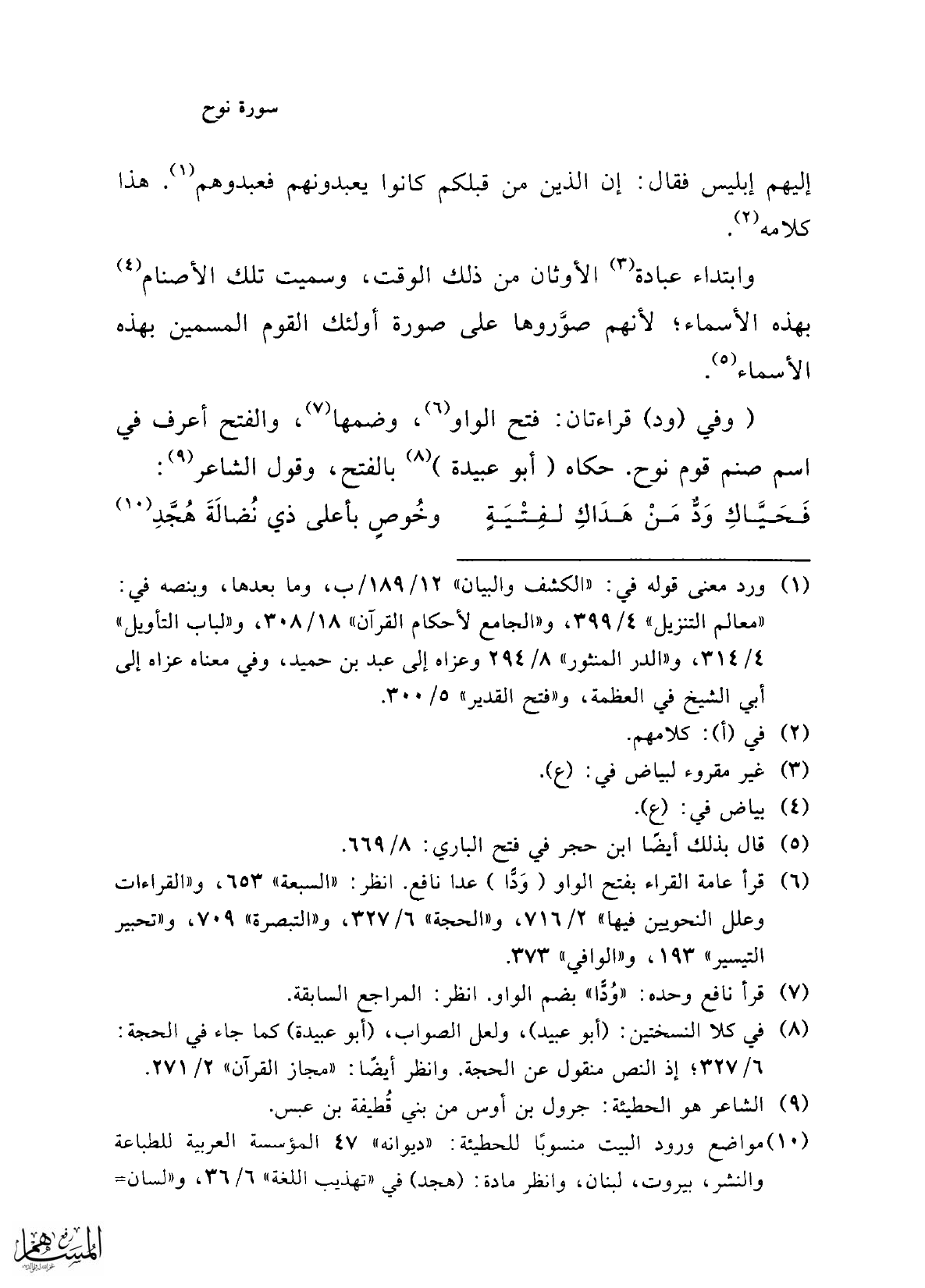 (¬3) في سورة إبراهيم: 36: {رَبِّ إِنَّهُنَّ أَضْلَلْنَ كَثِيرًا مِنَ النَّاسِ} قال أبو إسحاق وغيره: أي ضُلِّلُوا بسببها؛ لأن الأصنام لا تعقل، ولا تفعل شيئًا، كما تقول: قد فتنتني هذه الدار، أي أحببتها، واستحسنتها، وافتتنت بسببها. فلما ضل الناس بسببها صارت كأنها أضلتهم، فنسب الفعل إليهم. انظر: "تفسير البسيط" بتصرف.
