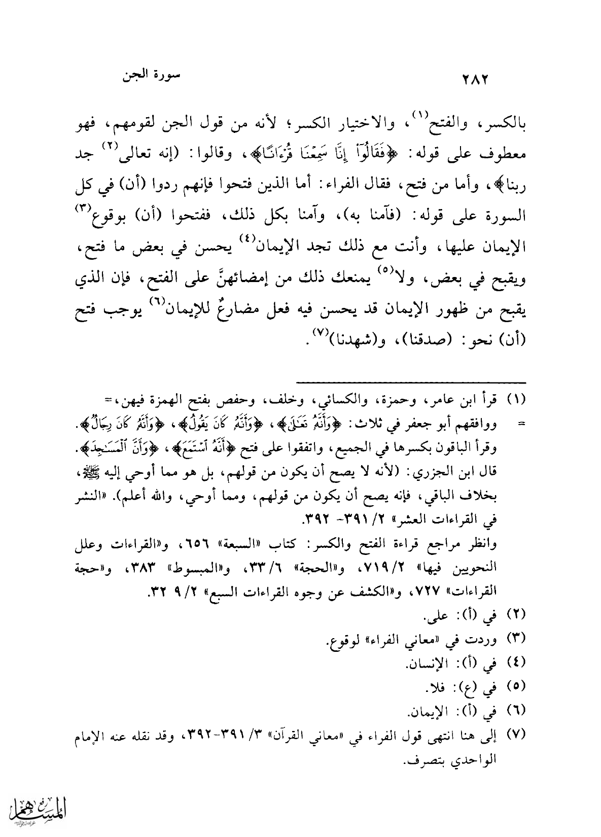 (¬2) لأن المعنى في فتح "أن" على العطف على "الهاء" أتم وأبين منه إذا عطفت على "أوحي إلى أنه". مرجع سابق.