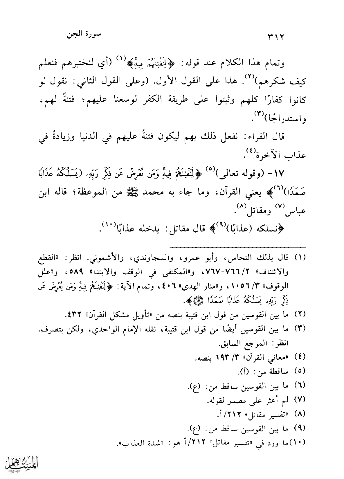 (¬8) "مجاز القرآن" 2/ 272، والعبارة عنه: {عَذَابًا صَعَدًا} مصدر صعود، وهو أشد العذاب.