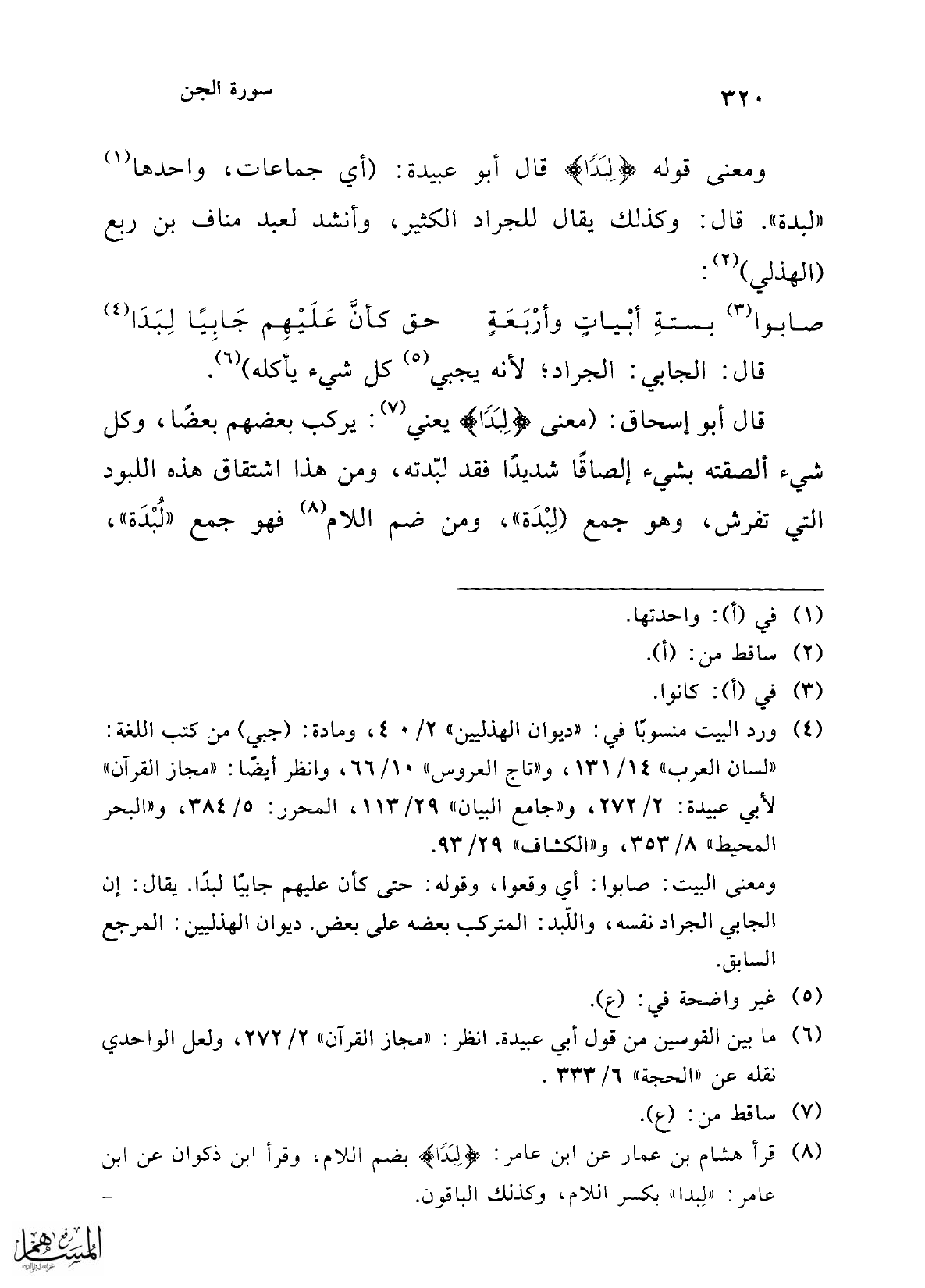 (¬1) "الكامل" 1/ 34 أو العبارة عنه قال: لِبْدَة الأسد: ما يتطارق مع شعره بين كتفيه، ويقال: أسد ذو لِبْدَة، وذو لَبد، وقد أورد الثعلبي بمعناه من غير عزو في "الكثسف والبيان" 12/ 196/ ب.