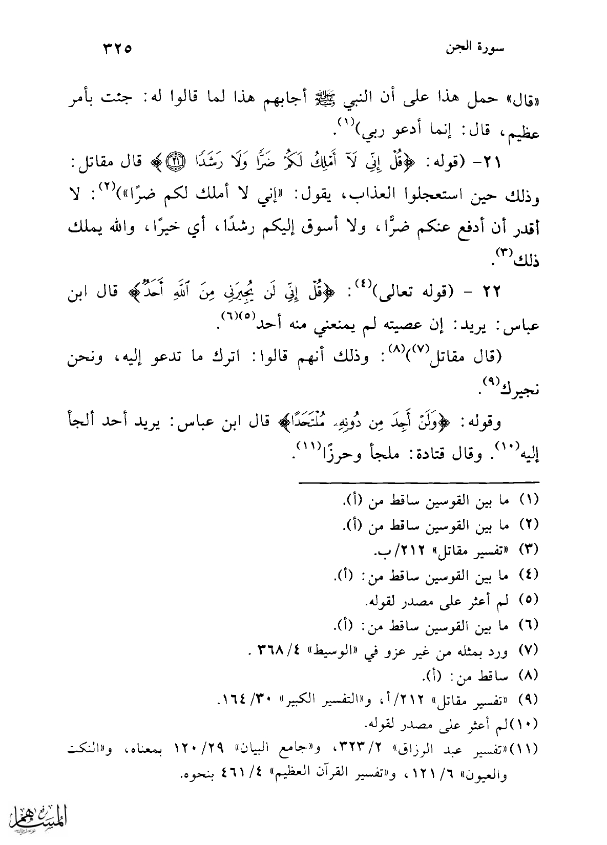 (¬5) "جامع البيان" 29/ 121 بمعناه، و"الكشف والبيان" 12/ 197/ أ، و"معالم التنزيل" 4/ 405، و"المحرر الوجيز" 5/ 384، و"الجامع لأحكام القرآن" 19/ 25، و"البحر المحيط" 8/ 354، و"الدر المنثور" 8/ 308، وعزاه إلى عبد بن حميد، وابن المنذر، و"فتح القدير" 5/ 310.
