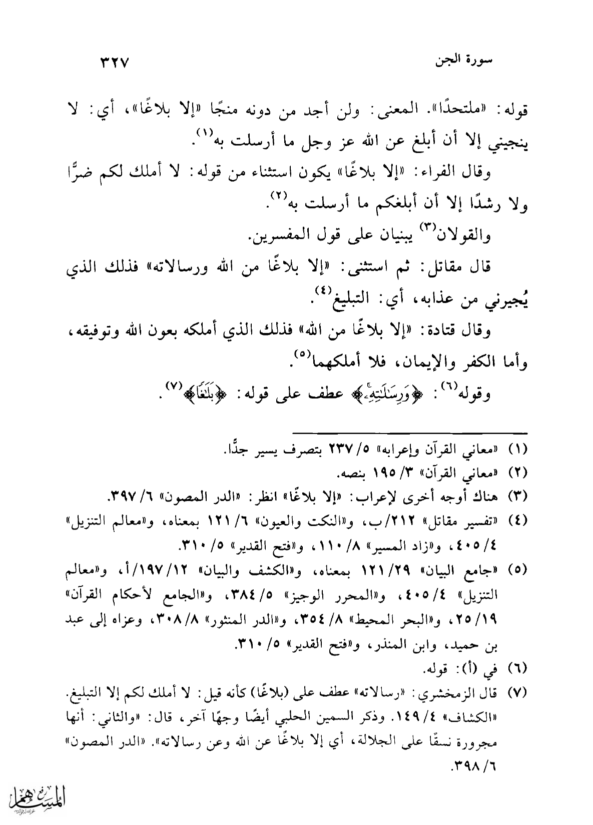 ومما جاء في تفسيره: قال الواحدي: (فـ (حتى) هاهنا حرف من حروف الابتداء يستأنف بعدها، كما يستأنف بعد (أما)، و (إذا)، وذلك أن (حتى) لها ثلاثة أحوال: إما أن تكون جارة، أو عاطفة، وحيث تنصب الفعل إنما تنصبه بإضمار (إن)، ومما جاء فيه (حتى) حرف مبتدأ قوله:
