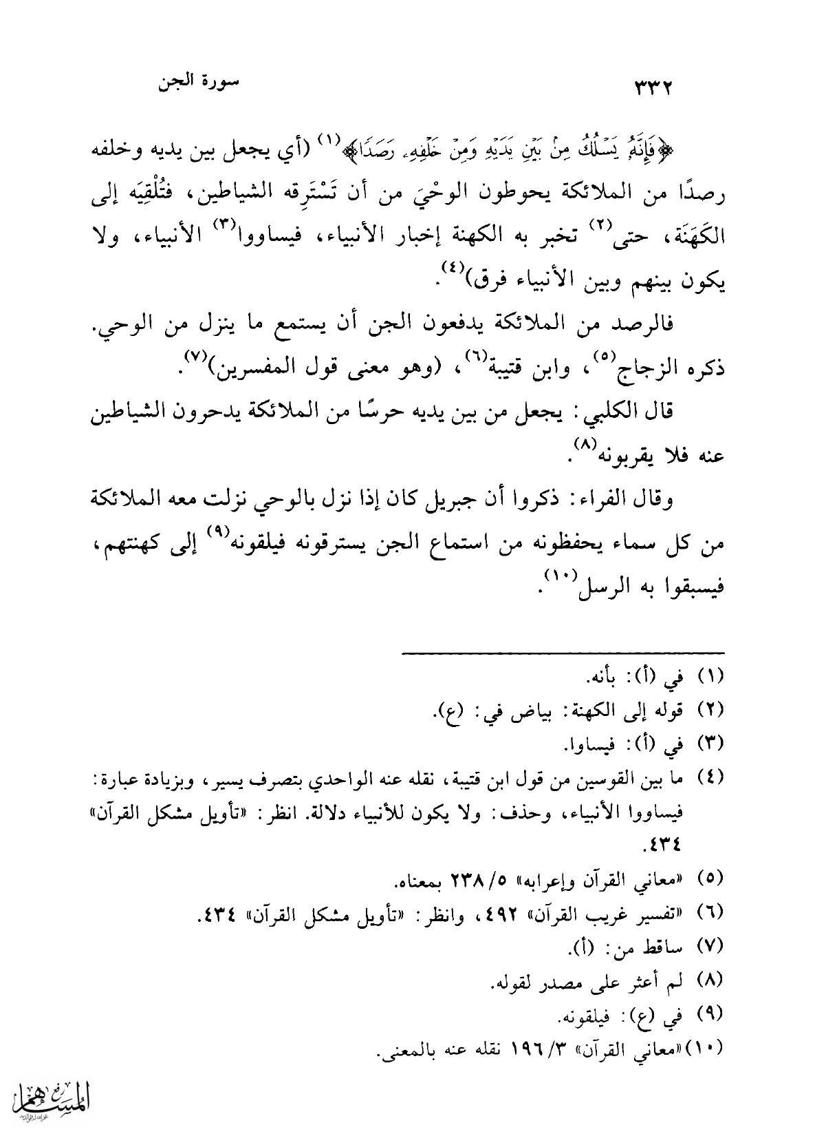 ويجوز أن يكون المعنى: ليعلم الرسل أنهم بلغوا رسالات ربهم على التحقيق من غير شك فيها؛ إذ كانوا محروسين عن الشياطين، فالذي يبلغونه (¬3) الخلق هو رسالات ربهم لا غير، وهي واصلة إليهم، ولم تصل إلى غيرهم.