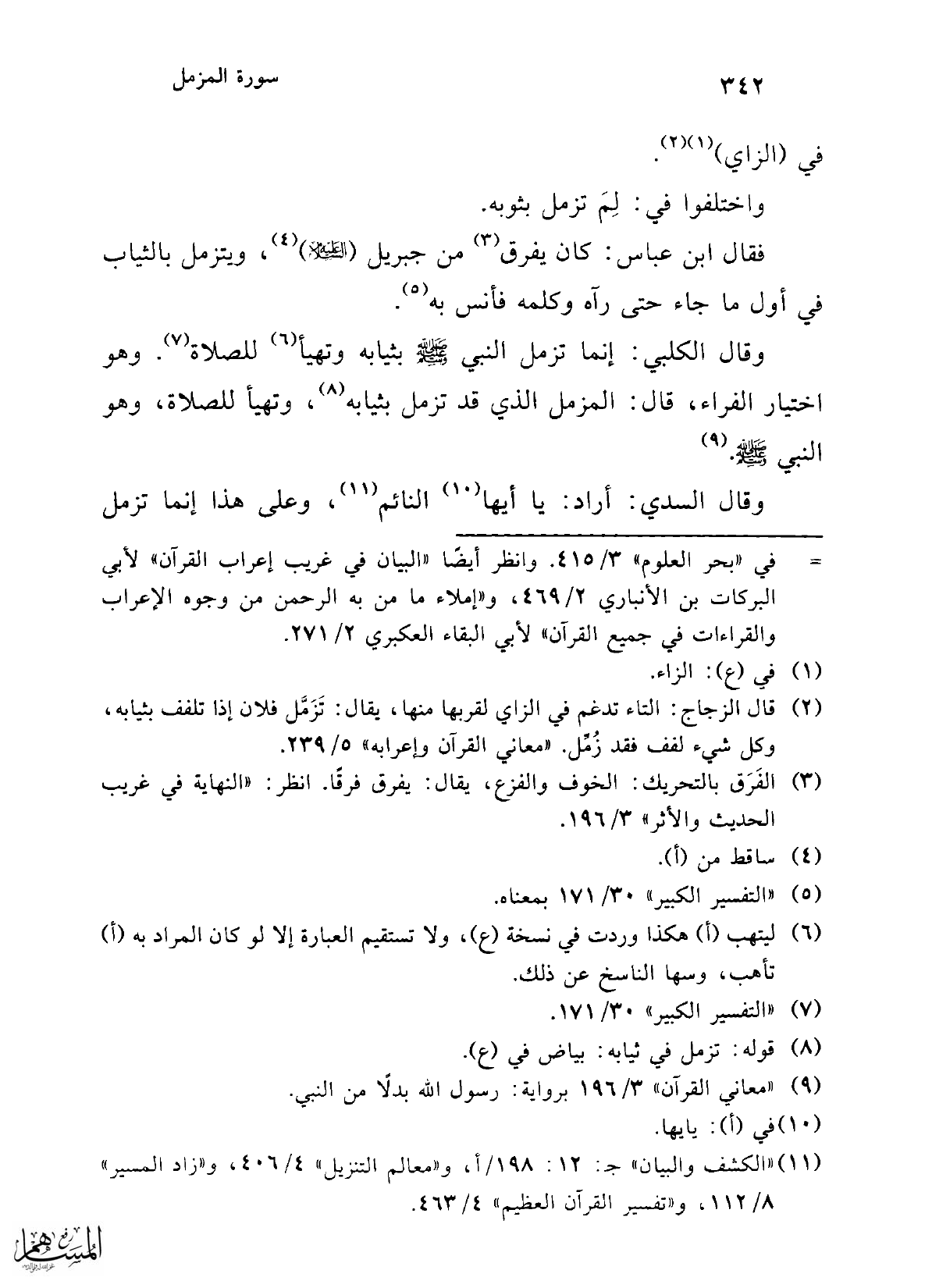 والقول في تزَمُّلِهِ عليه السلام (¬1) ما ذكره ابن عباس، فقد روى في حديث المبعث (¬2) أنه كان يأتي أهله فيقول: "زملوني زملوني" (¬3).