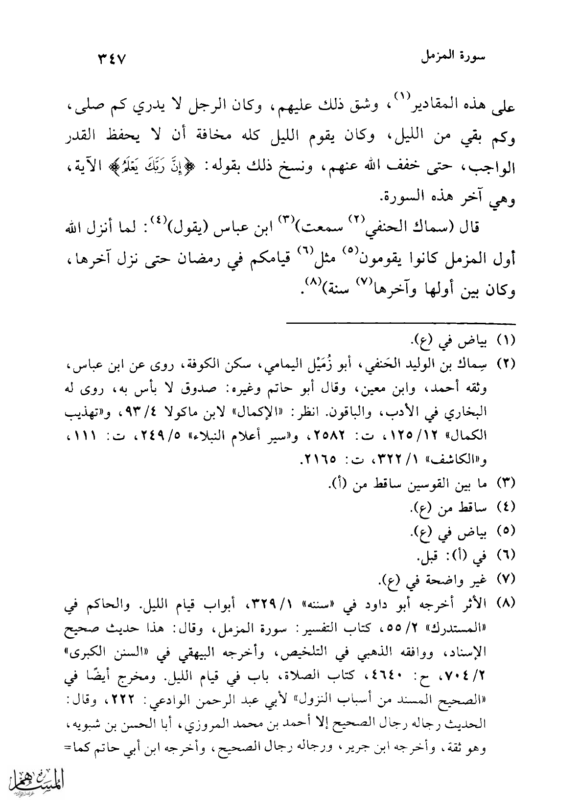 (¬6) "بحر العلوم" 3/ 416، و"معالم التنزيل" 4/ 407، و"الجامع لأحكام القرآن" 19/ 35، و"فتح القدير" 5/ 316. وهذا القول من مقاتل أن قيام الليل منسوخ بالصلوات الخمس، يرده الأقوال الماضية المتعاضدة في أن قيام الليل الوارد في أول المزمل منسوخ بآخر ما جاء في سورة المزمل. والله أعلم.
