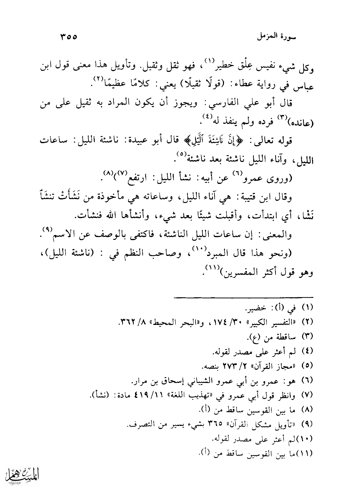 (¬8) العبارة الواردة بين القوسين الصغيرين: "إلا أنهما قالا" لا تعود على ابن مسعود وسعيد بن جبير، وإنما تعود على سعيد بن جبير وابن زيد، والسبب في ذلك أني لم أعثر إلا على قولي سعيد بن جبير وابن زيد مشتركين في هذا المعنى، ومصحوبين أثناء العزو إليهما كما في "الكشف والبيان" جـ: 12: جـ: 200/ ب،: قال: وقال سعيد بن جير وابن زيد: أي ساعة قام من الليل فقد نشأ، وهو بلسان الحبشة: نشأ إذا قام. وانظر أيضًا "معالم التنزيل" 4/ 408، و"المحرر الوجيز" 5/ 387، و"زاد المسير" 8/ 114.