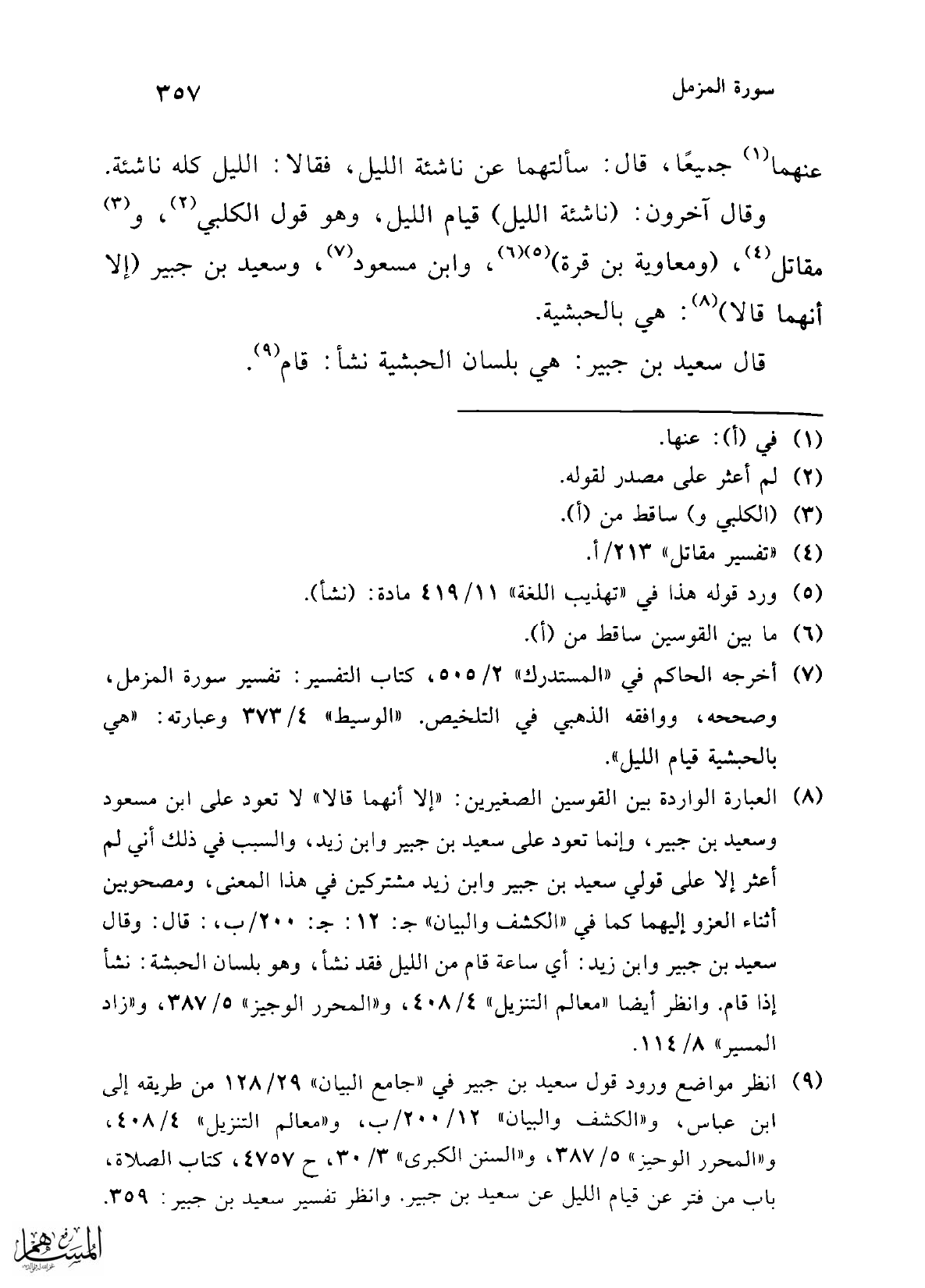 (¬5) "زاد المسير" 8/ 114، و"الجامع لأحكام القرآن" 19/ 39، و"لباب التأويل" 4/ 322، و"البحر المحيط" 8/ 363، و"الدر المنثور" 8/ 316، و"السنن الكبرى" 3/ 30، كتاب: الصلاة باب من فتر عن قيام الليل.