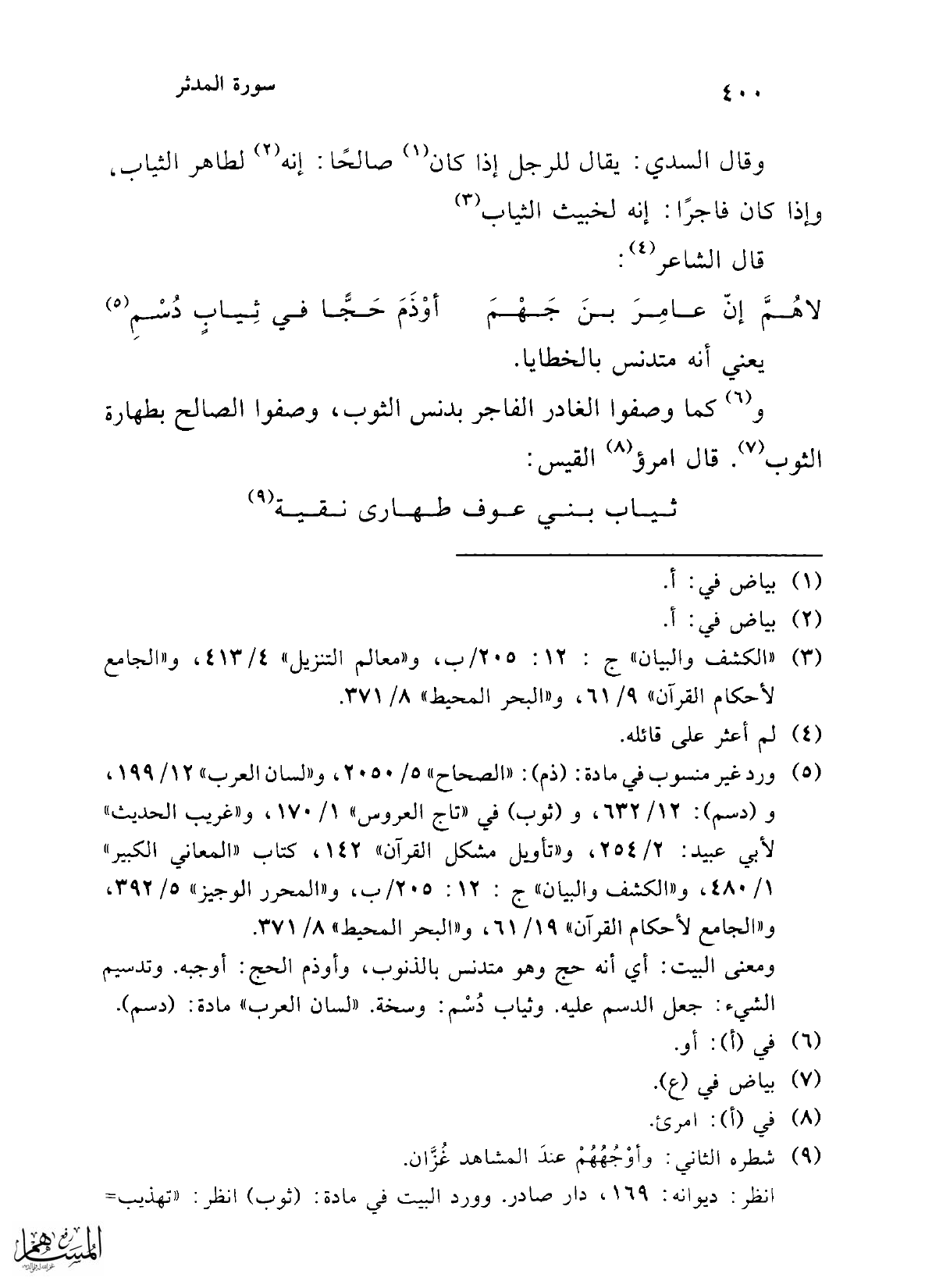 وقد ورد البيت في: ديوانه: 37 ط دار صادر، شرح المعلقات السبع: للزوزني: 19، وانظر مادة: (ثوب) في: "تهذيب اللغة" 1/ 154، و"لسان العرب" 1/ 246، و"تاج العروس" 1/ 170، و"النكت والعيون" 6/ 136، و"المدخل" 225 رقم: 213، و"الجامع لأحكام القرآن" 19/ 62.