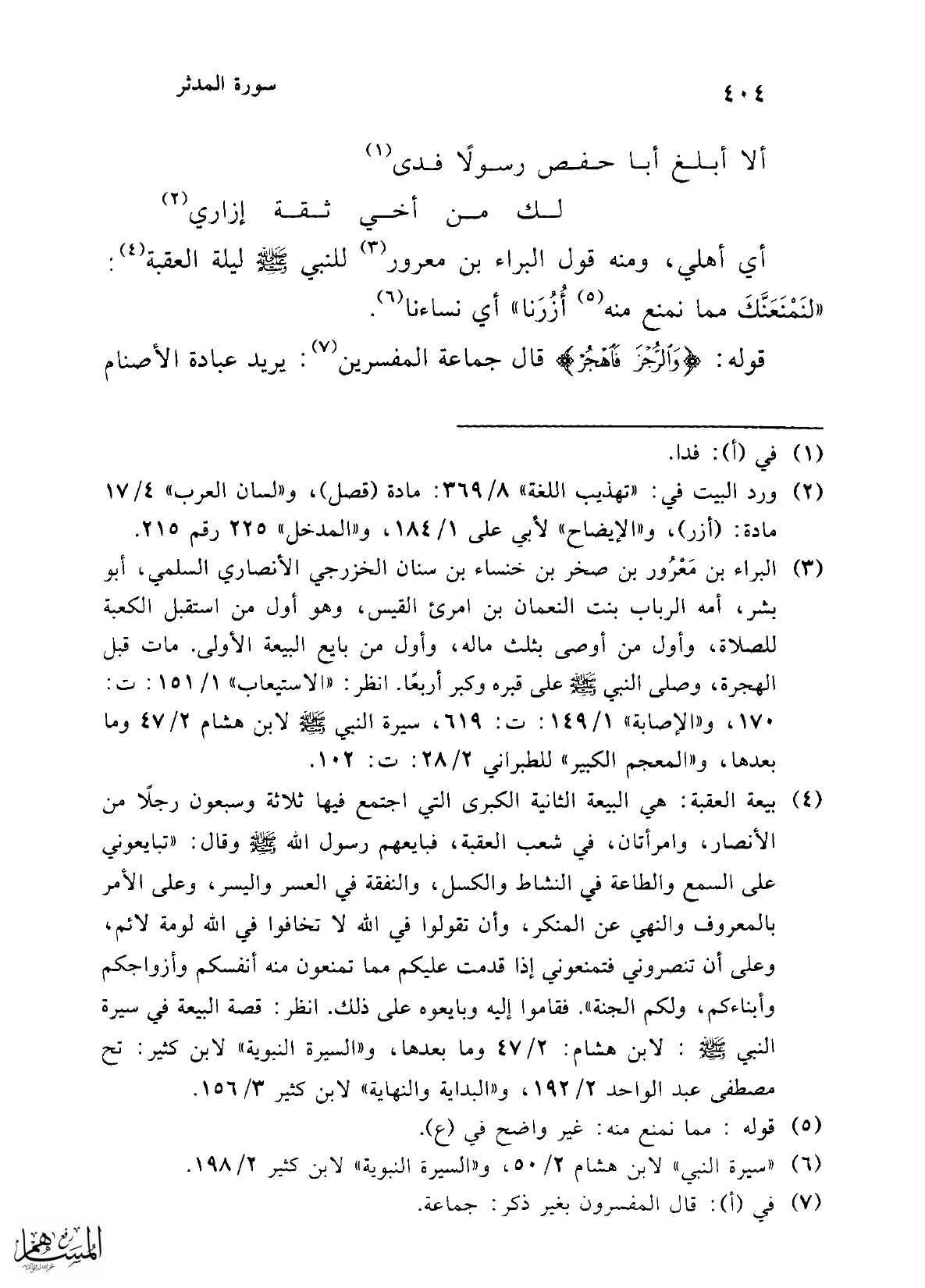 (¬7) "الكشف والبيان" 12/ 206/ ب، و"معالم التنزيل" 4/ 413، و"زاد المسير" 8/ 122.