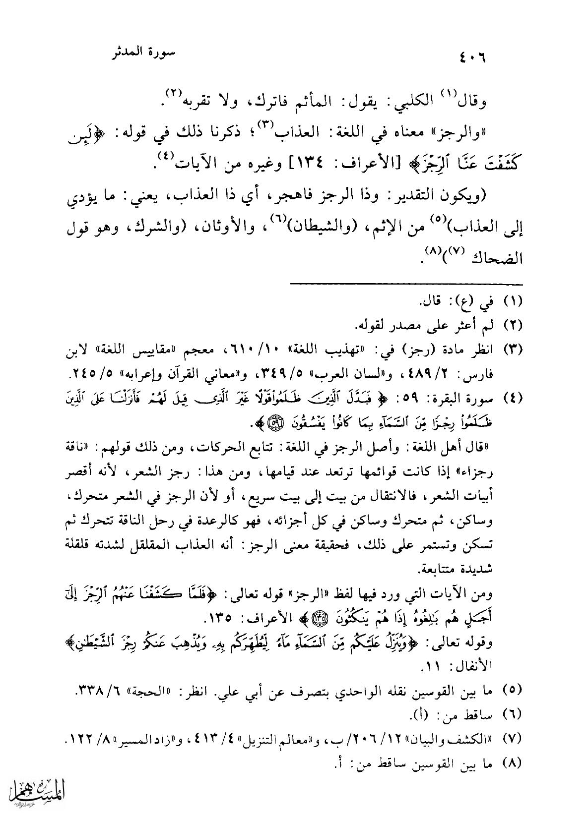 (¬3) "جامع البيان" 29/ 148 بمعناه، و"بحر العلوم" 3/ 421 بمعناه، و"تفسير القرآن العظيم" 4/ 470، و"الدر المنثور" 8/ 327 وعزاه إلى عبد بن حميد.