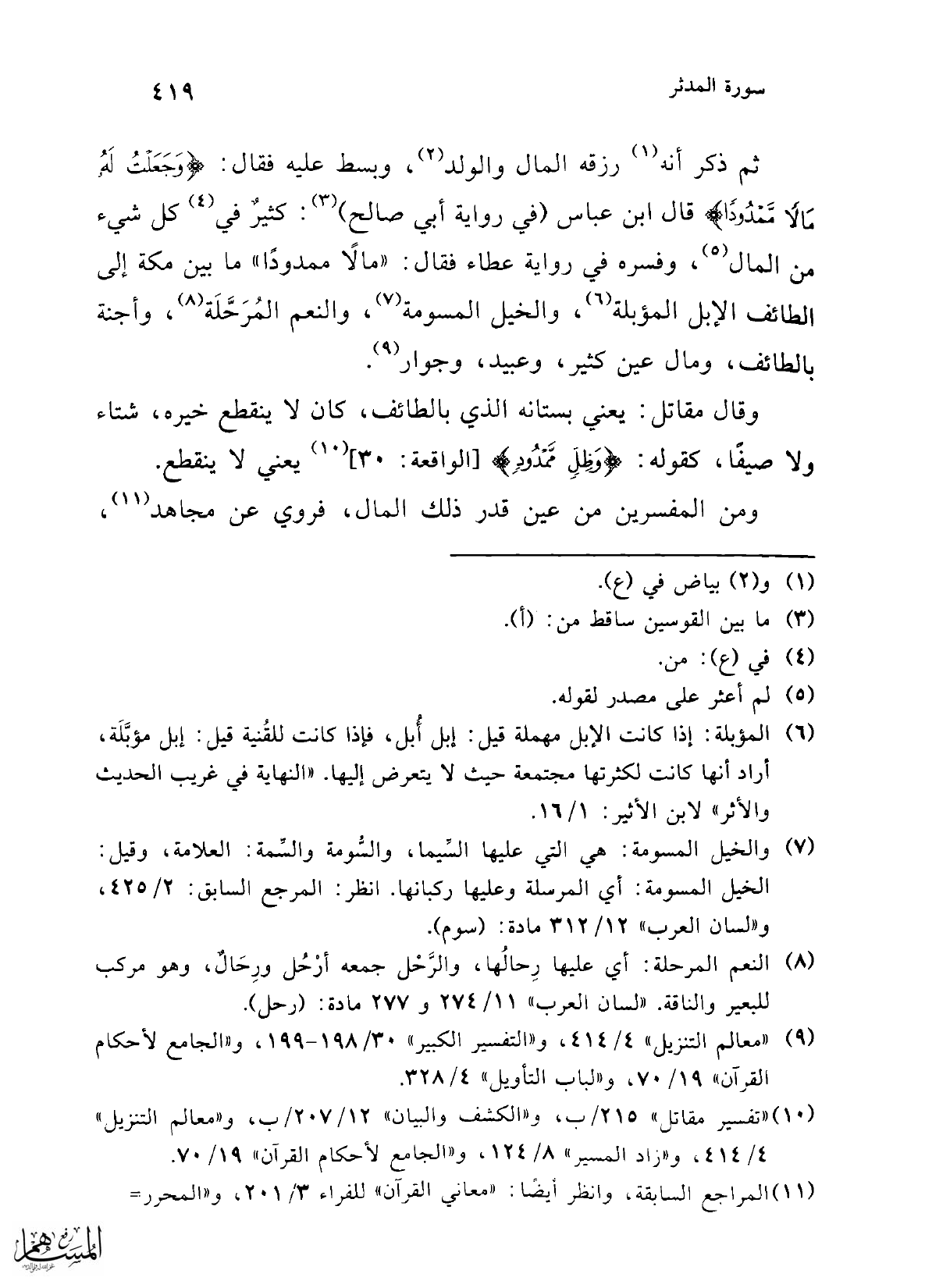 (¬9) "جامع البيان" 29/ 154، و"النكت والعيون" 6/ 140، و"الدر المنثور" 8/ 329 وعزاه إلى عبد بن حميد، وابن المنذر، وابن أبي حاتم.