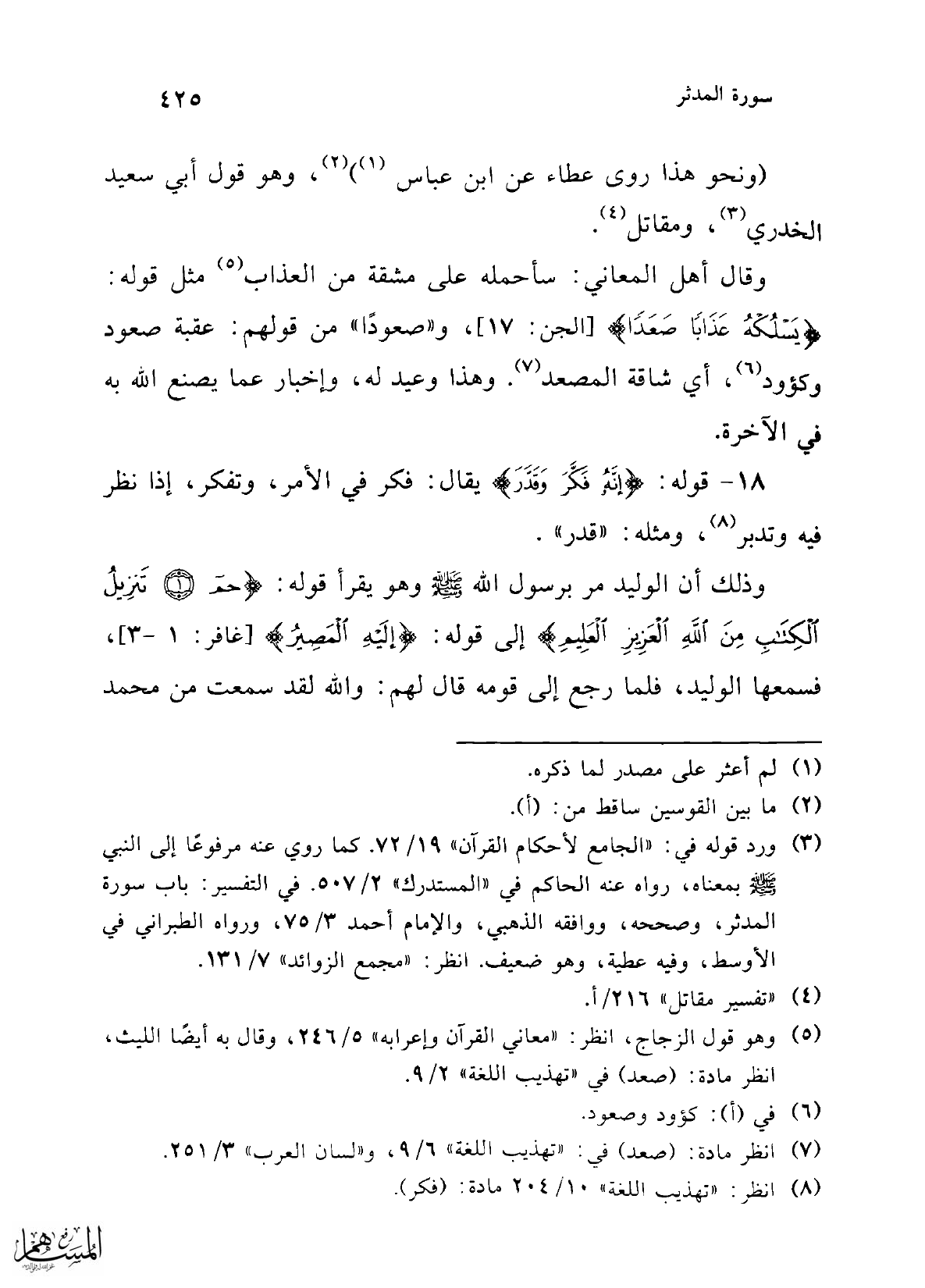 يخاطبونه فيعلمون أنه غير مجنون، قالوا (¬1): فنقول: إنه شاعر. قال: هم العرب يعلمون الشعر، ويعلمون أن ما أتى به ليس بشعر. قالوا: فنقول: إنه كاهن. قال: إنهم قد لقوا الكهان، فإذا سمعوا قوله لم يجدوه يشبه الكهانة فيكذبونكم، ثم انصرف إلى منزله، فقالوا: صبأ الوليد، فقال ابن أخيه أبو جهل بن هشام بن المغيرة: أنا أكفيكموه، فانطلق حتى دخل عليه محزونًا، فقال: مالك يا ابن أخي؟ فقال: إنك قد صبوت لتصيب من طعام محمد وأصحابه، وهذه (¬2) قريش تجمع لك مالاً لتكون عوضًا فيما تقدر أن تأخذ من أصحاب محمد، فقال: والله ما يسمعوني (¬3)، فكيف أقدر أن أخذ منهم مالًا؟ ولكني أكثرت حديث النفس في أمر هذا الرجل، وتفكرت في شأنه، فقوله قول ساحر، والذي يأتي به سحر (¬4). فذلك قوله: {إِنَّهُ فَكَّرَ}، قال ابن عباس: يريد في القرآن (¬5).
