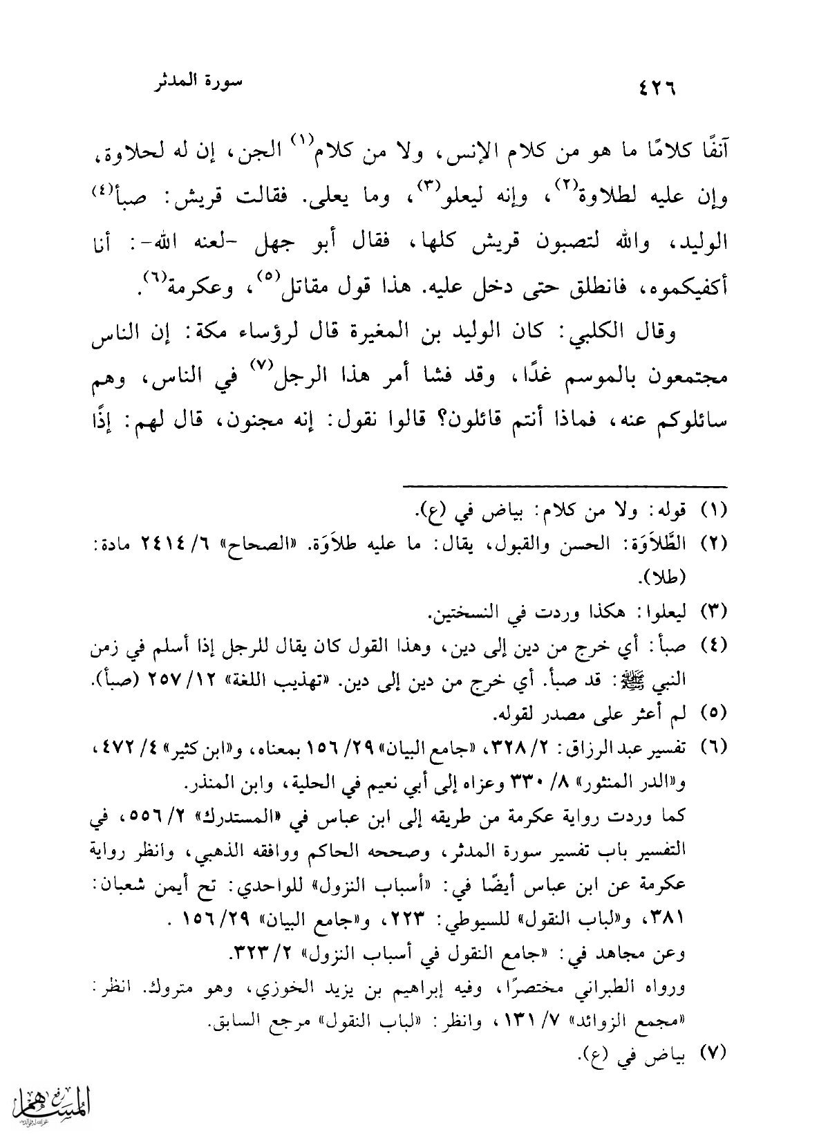 = "بحر العلوم" 3/ 422، والثعلبي في: "الكشف والبيان" 12: 209/ أ، والبغوي في: "معالم التنزيل" 4/ 416، وابن الجوزي في: "زاد المسير" 8/ 125، والقرطبي في: "الجامع لأحكام القرآن" 19/ 73.