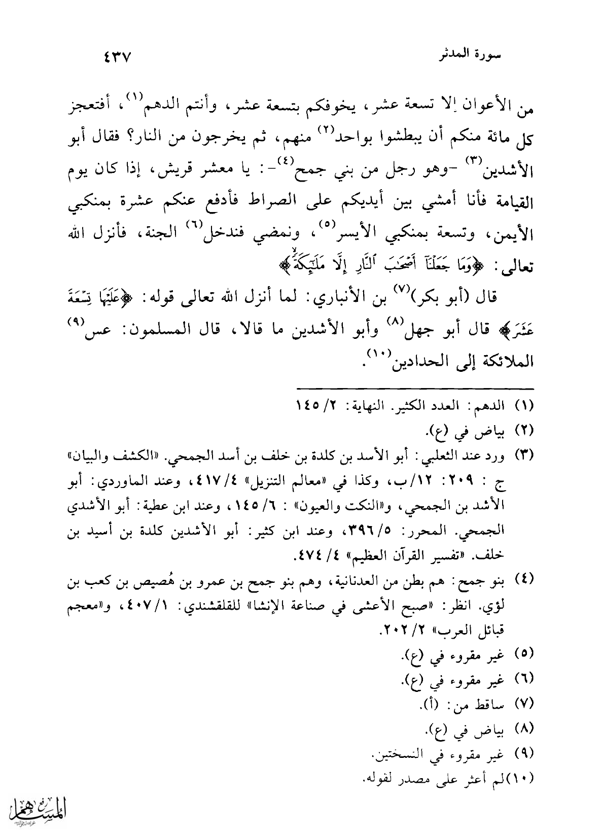 قال الكلبي: كان ذلك في كتب أهل الكتاب: تسعة عشر، كما نزل على رسول الله -صلى الله عليه وسلم- (¬3).