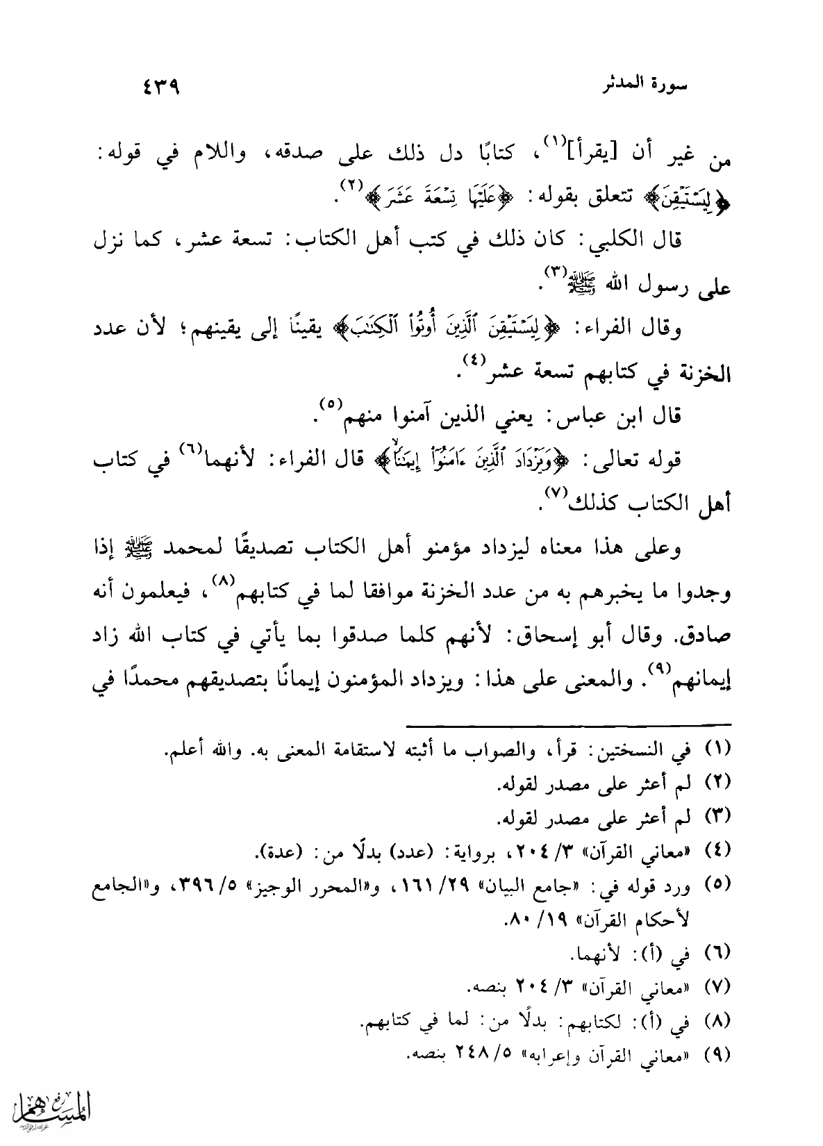 وقال عطاء (¬1)، (والكلبي (¬2)) (¬3): يعني الكفار من اليهود، والنصارى. والقول قول مقاتل (¬4)؛ لأن اليهود والنصارى يؤمنون بما (¬5) في كتابهم، فلا ينكرون عدد خزنة النار (¬6).