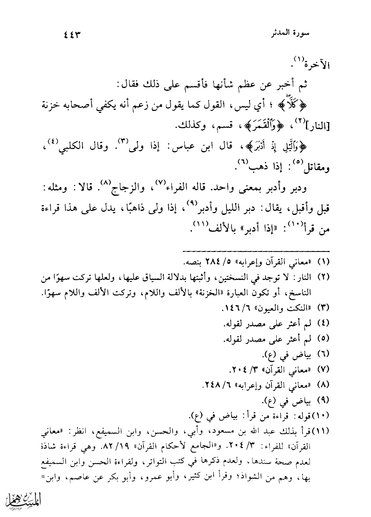 (¬5) "الكشف والبيان" 12/ 210/ ب بمعناه، و"معالم التنزيل" 4/ 418 بمعناه، و"التفسير الكبير" 30/ 209، و"الجامع لأحكام القرآن" 19/ 82 بمعناه