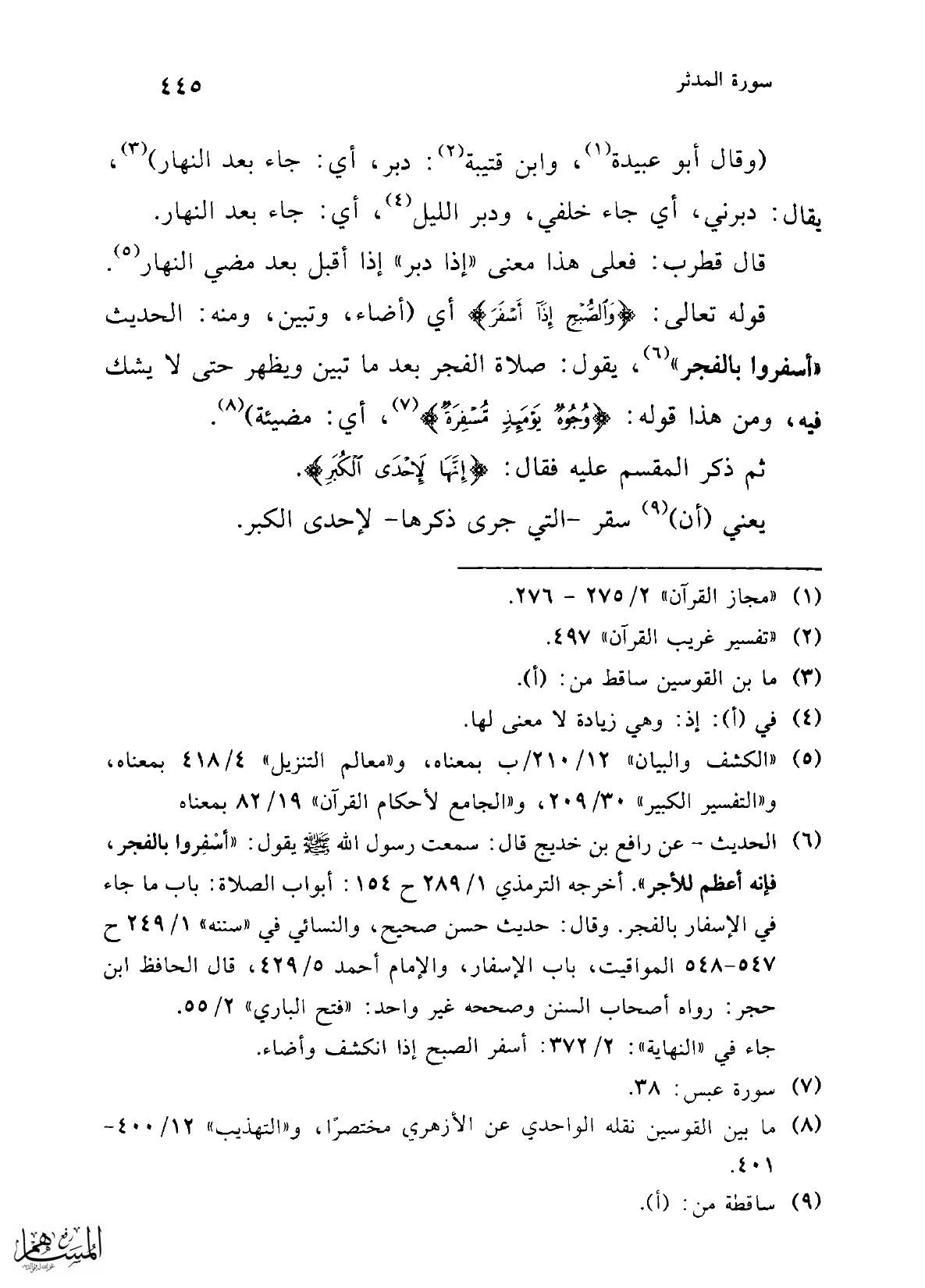 (وروي عن ابن كثير أنه قرأ {إنها لَحْدى (¬1) الكبر} موصولاً حذف الهمزة حذفًا. كما يقال: وَيْلُمِّهِ (¬2)، وقد جاء ذلك في الشعر، قال أبو الأسود: