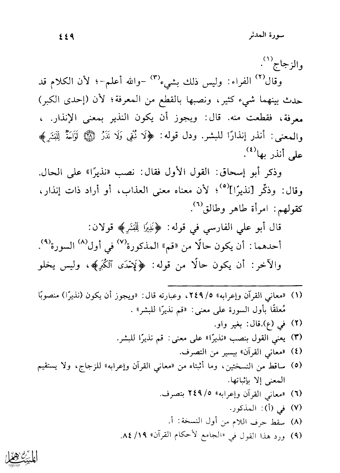 (¬6) في قوله: (ومعنى إضافة المشيئة إلى المخاطبين: التهديد) ما يفيد أن الإمام الواحدي قائل بقول الأشاعرة في مسألة فعل العبد حيث ينكرون أن تكون له قدرة مؤثرة، وقد سموا فعله: كسبا. قال د: عبد الرحمن المحمود معلقًا على ذلك: "والمؤلف ربما زاد على شيوخه حين نفى المشيئة التي للعبد، وأول ظاهر الآية إلى أن المقصود بها التهديد. والذي عليه أهل السنة والجماعة أن للعبد مشيئة بها يختار هذا وهذا. ولكنها خاضعة وداخلة تحت مشيئة الله تعالى، كما قال تعالى: {لِمَنْ شَاءَ مِنْكُمْ أَنْ يَسْتَقِيمَ (28) وَمَا تَشَاءُونَ إِلَّا أَنْ يَشَاءَ اللَّهُ رَبُّ الْعَالَمِينَ (29)}. فللعبد مشيئة حقيقية تليق به، ولله تعالى مشيئة تليق بجلاله وكماله، ولا تنافي بينهما" انظر: شرح العقيدة الطحاوية: 95، وكتابه محرر بتاريخ 18/ 8/18 هـ. من د: عبد الرحمن المحمود.