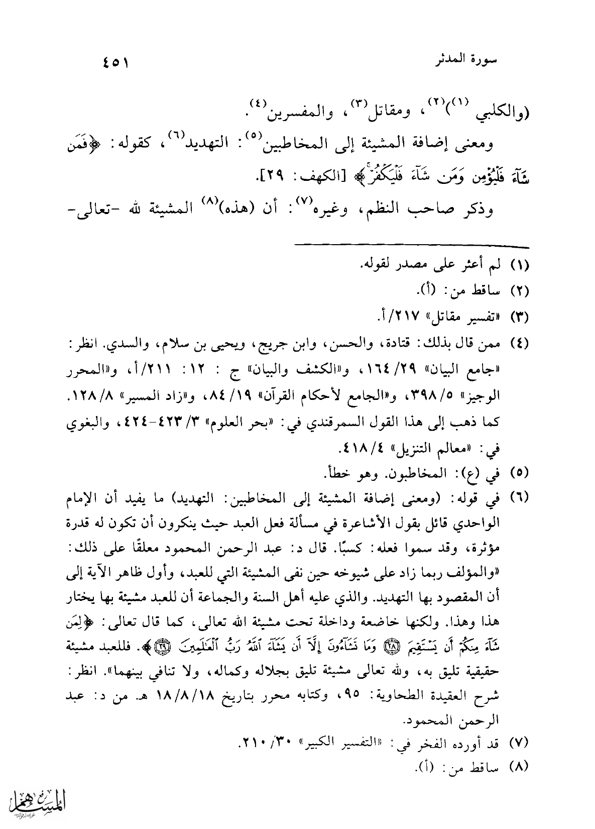 (¬9) "الكشف والبيان" ج: 12: 211/ أ، و"المحرر الوجيز" 5/ 398، و"الجامع لأحكام القرآن" 19/ 85، و"البحر المحيط" 8/ 379.