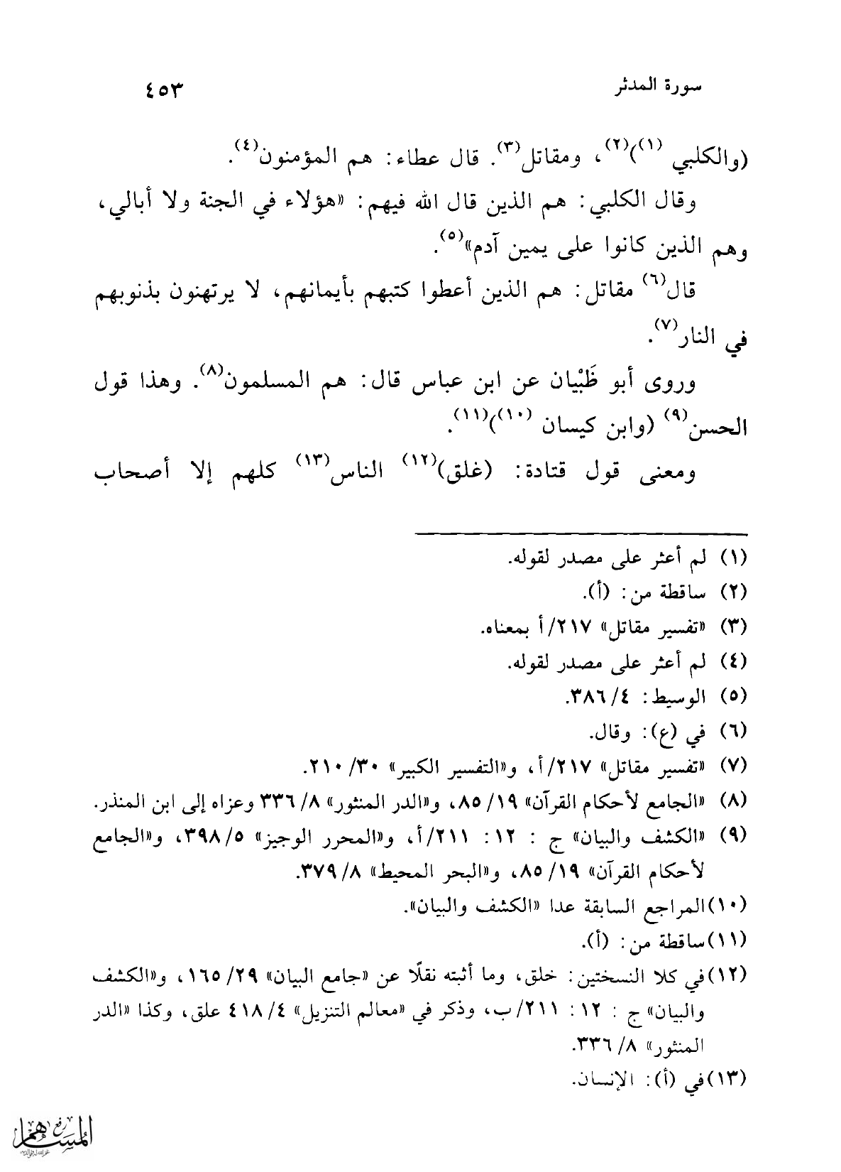 قال الفراء: وهو شبيه بالصواب؛ لأن الوِلْدان [لم] (1) يكتسبوا (2) إثمًا يرتهنون به؛ لأن في قوله: {يَتَسَاءَلُونَ (40) عَنِ الْمُجْرِمِينَ (41) مَا سَلَكَكُمْ فِي سَقَرَ (42)} ما يقوي أنهم الولدان؛ (لأنهم) (3) لم يعرفوا الذنوب، فسألوا: {مَا سَلَكَكُمْ فِي سَقَر (42)} (4):