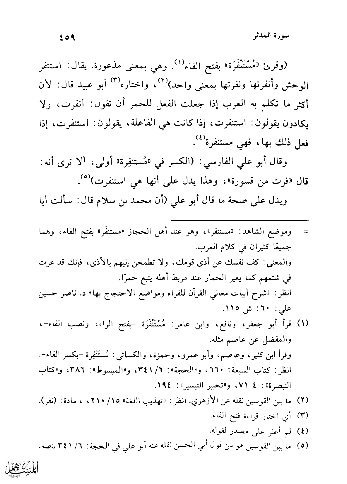 قال ابن عباس: الحمر الوحشية إذا عاينت الأسد هربت منه، كذلك هؤلاء المشركون إذا رأوا محمدًا -صلى الله عليه وسلم-، أو سمعوه يقرأ، هربوا منه كما تهرب الحمير من الأسد (¬3).