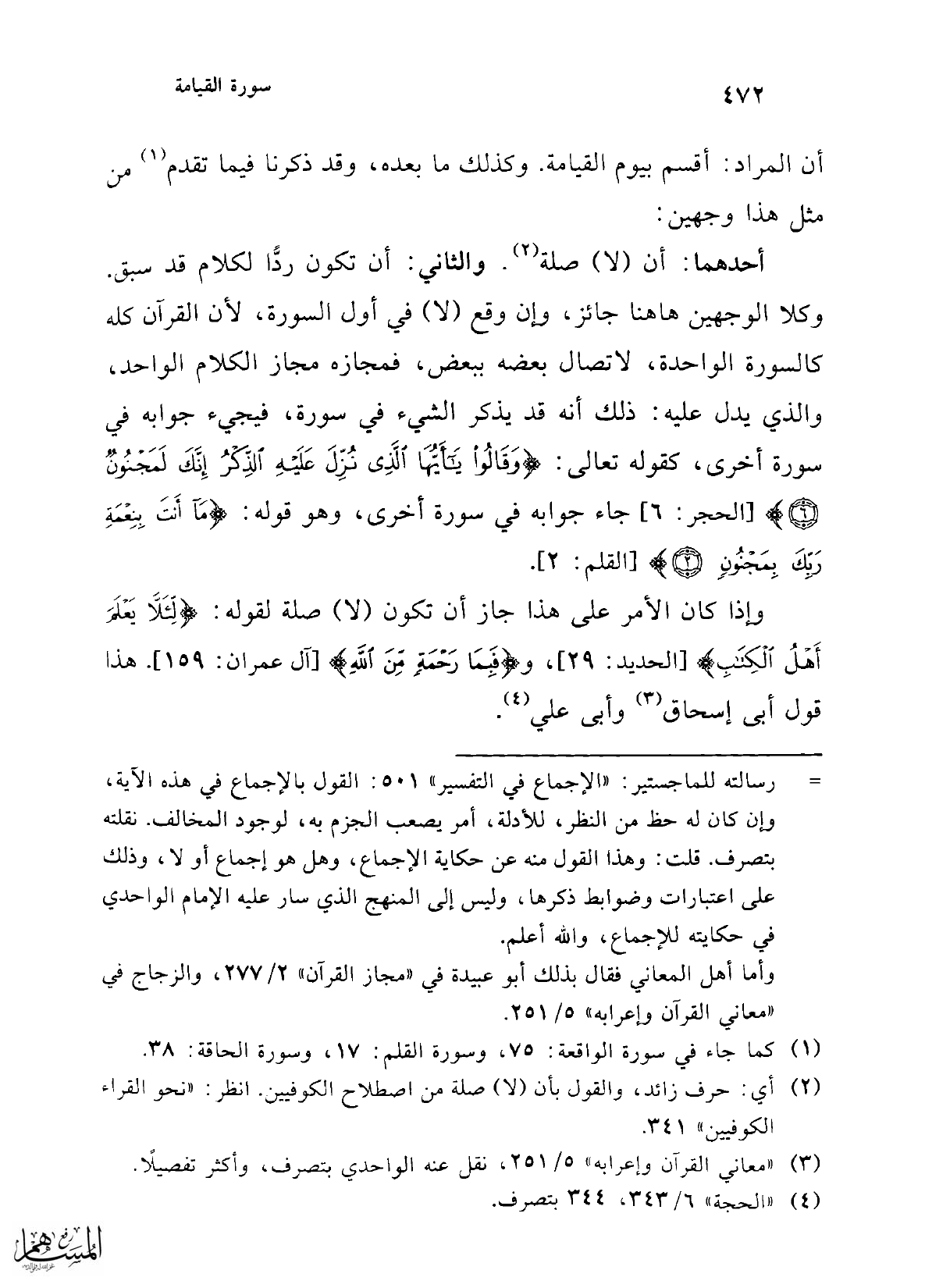(¬1) لا خلاف بين القراء في إثبات الألف في الموضع الثاني، وهو: (ولا أقسم بالنفس).