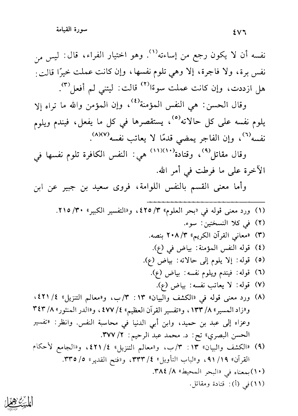 (¬6) "تفسير عبد الرزاق" 2/ 333 مختصرًا، و"جامع البيان" 29/ 176، و"النكت والعيون" 6/ 152 وعبارته فيهما: (بلى قادرين على أن نجعل كفه التي يأكل بها ويعمل، حافر حمار أو خف بعير. فلا يأكل إلا بفيه ولا يعمل بيده شيئًا).