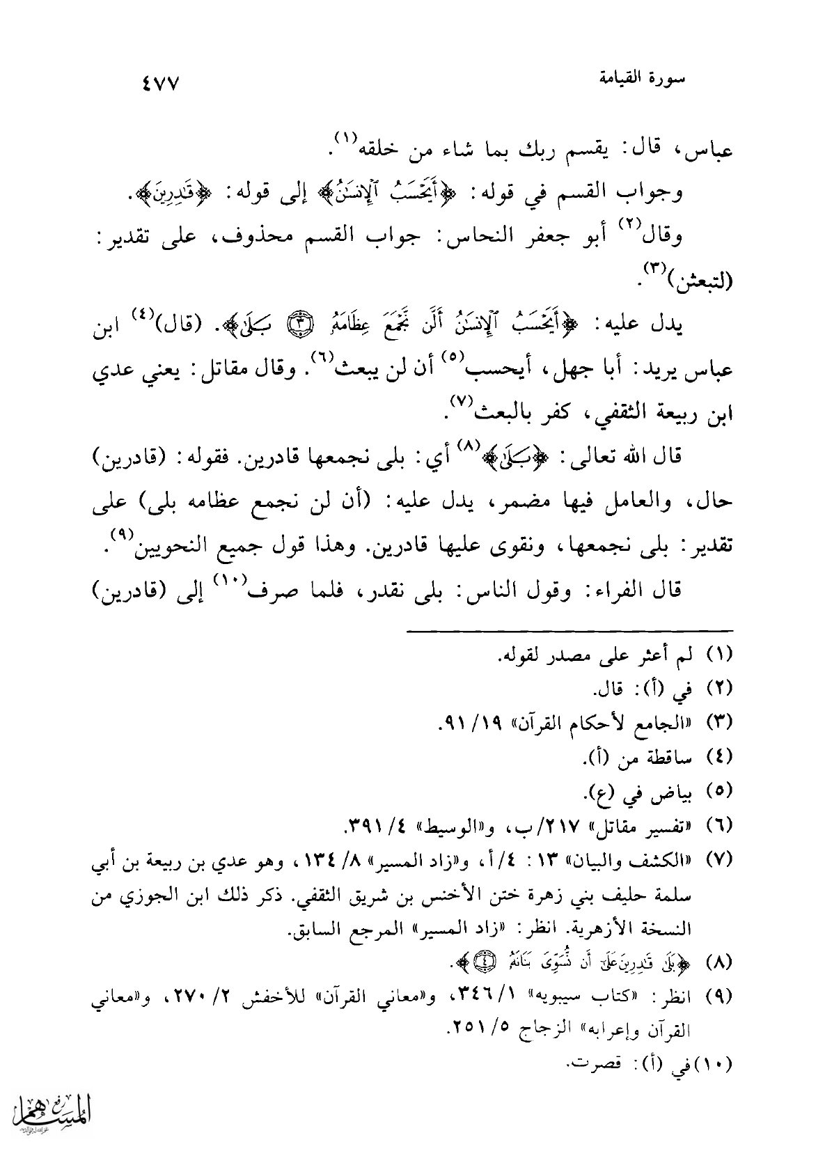 وشرحه أبو علي (الفارسي) (¬5) فقال: بلى قادرين على أن نسوي بنانه أي نجعلها مع كفه كصفيحة مستوية، لا شقوق فيها، كخف البعير فيعدم الارتفاق بالأعمال اللطيفة كالكتابة، والخياطة (والْخَرْز) (¬6) (¬7) ونحو ذلك من لطيف الأعمال التي يستعان عليها بالأصابع (¬8).