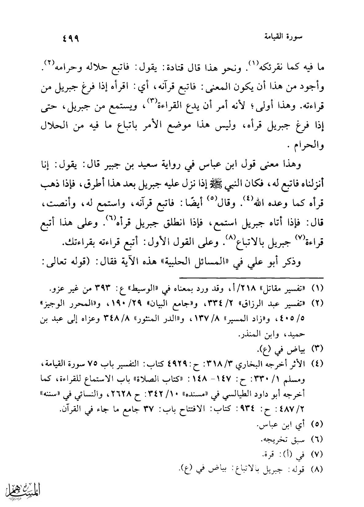 19 - قوله: {ثُمَّ إِنَّ عَلَيْنَا بَيَانَهُ (19)}، قال عطاء عن ابن عباس: ثم إن علينا تفسير ذلك (¬3)، وقال مقاتل: علينا أن نبين لك حلاله وحرامه (¬4). وأجود من هذا، ما روي عن ابن عباس {ثُمَّ إِنَّ عَلَيْنَا بَيَانَهُ (19)}: بلسانك (¬5).