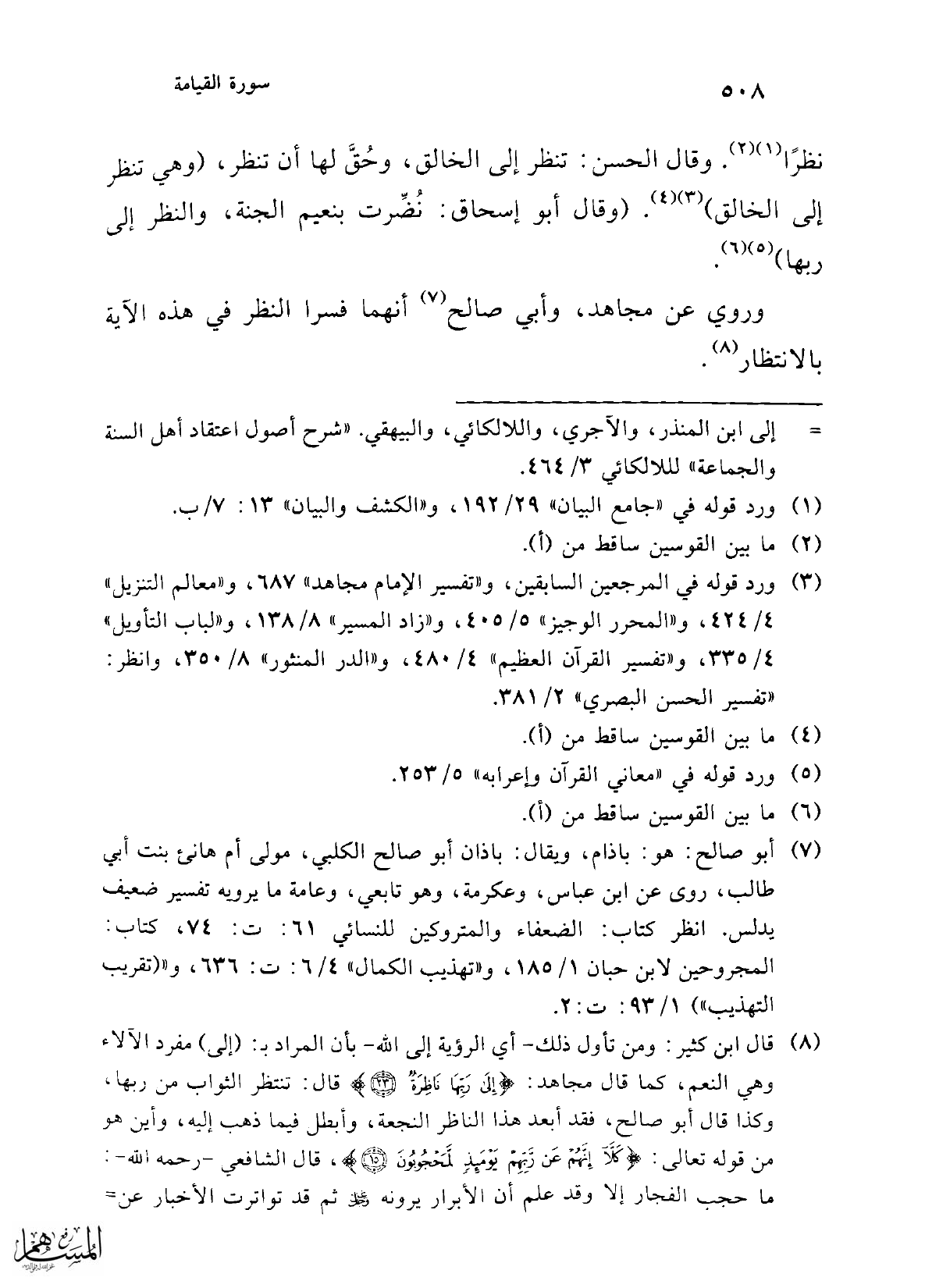 (¬4) قال شارح الطحاوية: وإضافة النظر إلى الوجه الذي هو محله في هذه الآية وتعديته بأداة (إلى) الصريحة في نظر العين، وإخلاء الكلام من قرينة تدل على خلافه حقيقة موضوعة صريحة في أن الله أراد بذلك نظر العين التي في الوجه إلى الرب -جل جلاله-. انتهى كلامه. كما عد هذه الآية {إِلَى رَبِّهَا نَاظِرَةٌ (23)} من أظهر الأدلة على رؤية الله سبحانه وتعالى. انظر: "شرح العقيدة الطحاوية" 146 - 148.