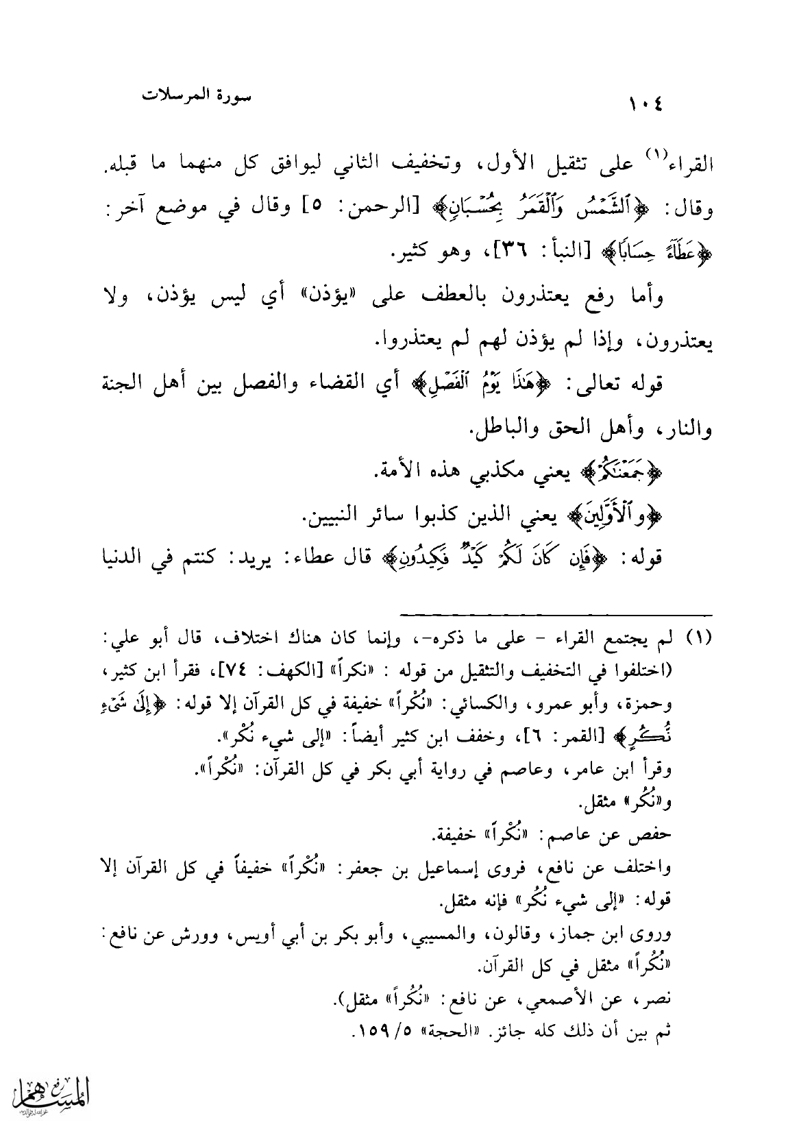(¬1) لم يجتمع القراء -على ما ذكره-، وإنما كان هناك اختلاف، قال أبو علي: (اختلفوا في التخفيف والتثقيل من قوله: "نكراً" [الكهف: 74]، فقرأ ابن كثير، وحمزة، وأبو عمرو، والكسائي: "نُكْراً" خفيفة في كل القرآن إلا قوله: {إِلَى شَيْءٍ نُكُرٍ} [القمر: 6]، وخفف ابن كثير أيضًا: "إلى شيء نكْر".