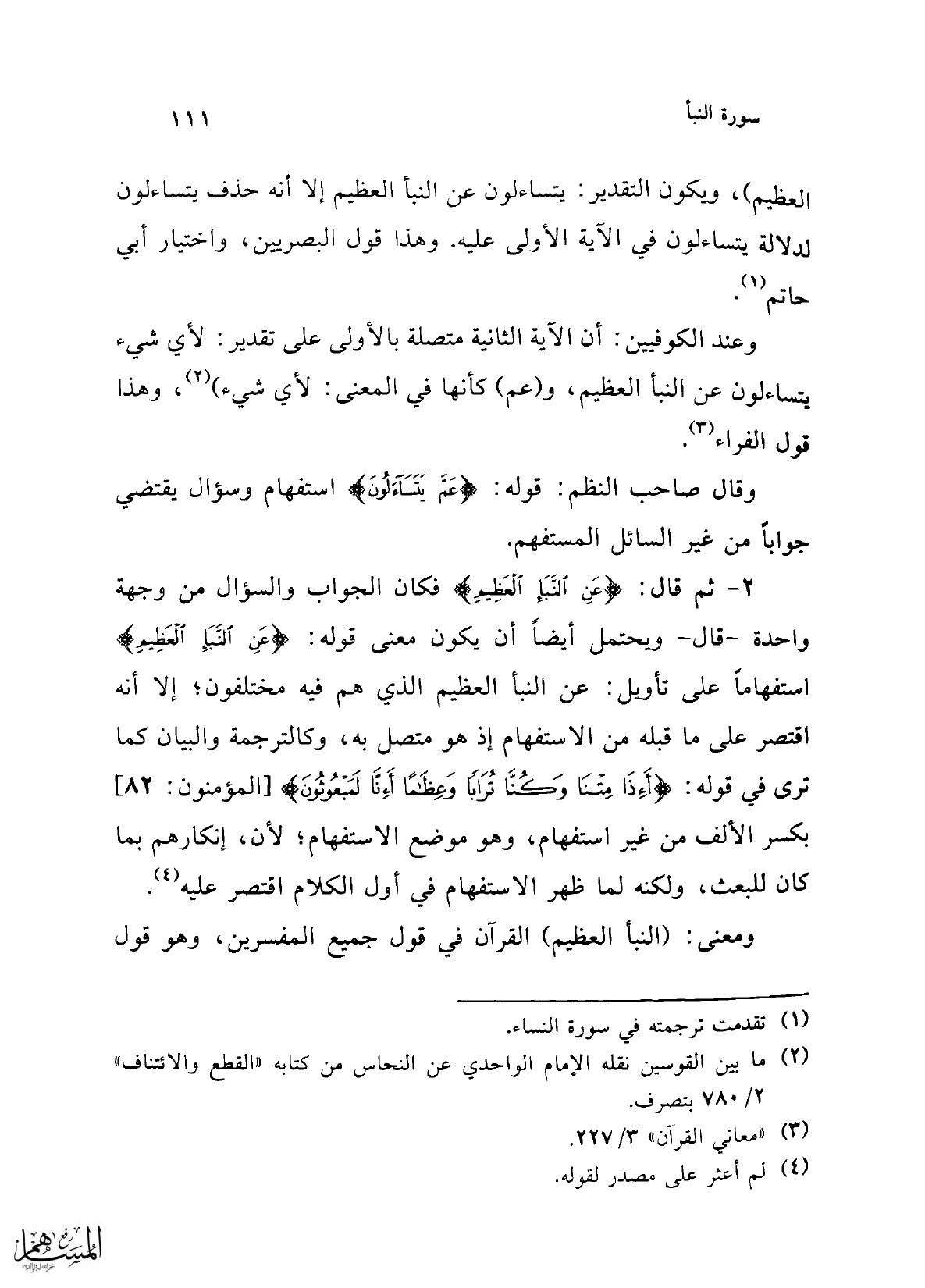 2 - ثم قال: {عَنِ النَّبَإِ الْعَظِيمِ} فكان الجواب والسؤال من وجهة واحدة -قال- ويحتمل أيضًا أن يكون معنى قوله: {عَنِ النَّبَإِ الْعَظِيمِ} استفهاماً على تأويل: عن النبأ العظيم الذي هم فيه مختلفون؛ إلا أنه اقتصر على ما قبله من الاستفهام إذ هو متصل به، وكالترجمة والبيان كما ترى في قوله: {أَإِذَا مِتْنَا وَكُنَّا تُرَابًا وَعِظَامًا أَإِنَّا لَمَبْعُوثُونَ} [المؤمنون: 82]، بكسر الألف من غير استفهام، وهو موضع الاستفهام؛ لأن، إنكارهم بما كان للبعث، ولكنه لما ظهر الاستفهام في أول الكلام اقتصر عليه (¬4).